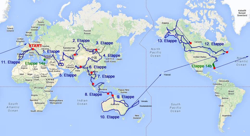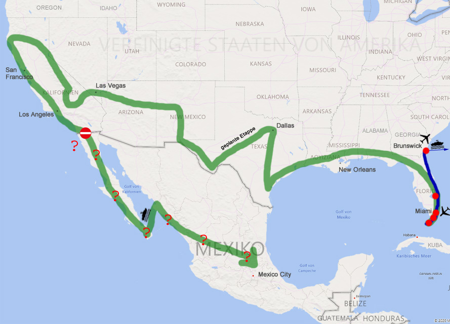 Ein drittes Mal wollen wir den nordamerikanischen Kontinent queren: Die 14. Etappe unserer Weltreise startet in Miami und führt uns quer durch die USA bis Kalifornien. Auf dem Weg liegen Städte mit klingenden Namen: New Orleans, Houston, Dallas, Santa Fe, Las Vegas. Im Death Valley erreichen wir den tiefst gelegenen Punkt unserer Weltreise. Von den Redwoods, wo die größten Bäume der Erde auf uns warten, geht es an der Pazifikküste entlang über San Francisco und Los Angeles nach San Diego. In Mexiko fahren wir die nadelförmige und fast 1.500 Kilometer lange Halbinsel Baja California entlang. Mit einer Fähre gelangen wir auf das mexikanische Festland. So sahen unsere Pläne aus, bis uns 11 Tage vor dem geplanten Start am 23. März 2020 das wegen der Pandemie von der US-Regierung verhängte Einreiseverbot für Europäer einen dicken Strich durch die Rechnung macht. Wir sind zunächst voll sauer, aber bald wird uns klar, dass es bestimmt angenehmer und sicherer ist, während des Corona-Shutdowns zu Hause zu sein als in den USA. Wir müssen die Etappe auf unbestimmte Zeit verschieben. Im Spätsommer sind wir schon sehr unruhig, weil wir schon ein dreiviertel Jahr zu Hause hocken und ein Ende des Einreiseverbotes nicht in Sicht ist. Wir suchen nach Wegen, wie wir doch in die USA kommen könnten und siehe da, es ist ganz einfach, denn es handelt sich nicht um ein Einreiseverbot für Europäer, sondern um ein Einreiseverbot für Personen, die sich in den letzten 14 Tagen im Schengen-Raum aufgehalten haben. Wenn wir also zwei Wochen Urlaub außerhalb des Schengen-Raumes machten ... Wir wählen für einen 15-tägigen Urlaub die Türkei, da es Flüge dorthin und von dort direkt in die USA gibt (im Gegensatz zu z.B. Kap Verde), man unkompliziert einreisen kann (im Gegensatz zu den karibischen Staaten), es dort warm ist und sie nicht am anderen Ende der Welt liegt (wie z.B. die Südsee). Am 21. September fliegen wir nach Antalya und am 6. Oktober geht es weiter nach Miami. Voraussichtlich müssen wir die Etappe (siehe oben) ein wenig kürzen, da zumindest momentan die Landgrenzen zu Mexiko geschlossen sind. Der Plan ist, den Zerberus in der Gegend um San Diego abzustellen und, sofern der Flugverkehr bis dahin nicht weiter eingeschränkt ist, vor Weihnachten wieder zurück zu sein. Doch kaum eine Woche in den USA lässt uns das Zusammentreffen mehrerer widriger Umstände technischer, politischer und persönlicher Natur die Weltreise abrupt abbrechen. Wir versuchen, den Zerberus heimzubringen. Wir danken Anna, Eva und Sonja, Regina Bolowich in Lake Worth und Andrew Sarantidis in West Palm Springs, sowie dem ÖAMTC und Progressive Insurance, Ohio.