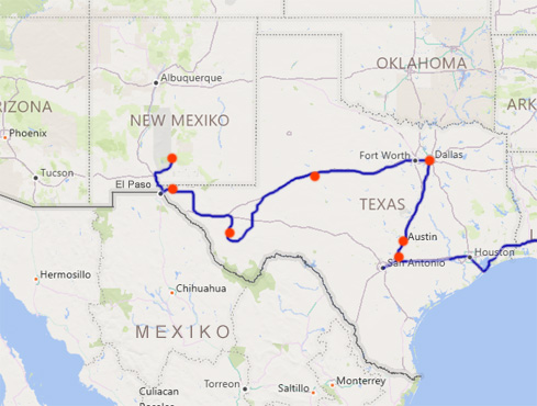 Zu Mittag sind wir in Dallas. Die goldglänzenden Hochhäuser, die man aus dem Fernsehen kennt, gibt es wirklich. Wir sehen uns ein Freilichtmuseum an, dessen Häuser man auch innen besichtigen kann, und die mit reichlich altem Inventar aufwarten, statten der kleinen Crow Collection of Asian Art und dem Dallas Museum of Art einen Besuch ab und sehen uns an der Pioneer Plaza den mit 40 überlebensgroßen Langhornrinderstatuen aus Bronze dargestellten Viehtrieb an. Mit guten Nachtplätzen sieht es schwierig aus, wir übernachten auf einem Parkplatz, wo sich leider nach Einbruch der Dunkelheit junge Leute einen Wettstreit an lauter Musik aus dem Autoradio liefern. Km 366/3.957/147.573.