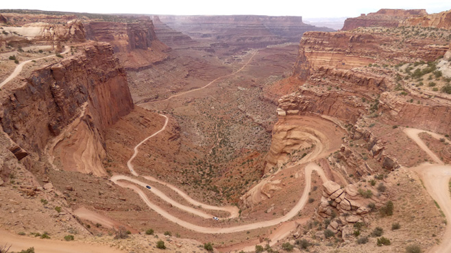 In die Ebene, auf der wir uns befinden, hat der mäandernde Colorado River tiefe Canyons eingeschnitten. Der Deadhorse Point liegt auf dem spitz zulaufenden Ende eines Ausläufers der Hochebene. Von hier hat man einen spektakulären Blick nach drei Seiten in die Tiefebene und die Canyons darin. Ein paar Meilen weiter befindet sich das Gate des Canyonland Nationalparks. Der Name sagt schon alles. Von unzähligen Aussichtspunkten hat man fantastische Ausblicke in die Canyons des Colorado Rivers und seiner Nebenflüsse. An einer Stelle sieht man beim Blick in die Tiefe, dass in den fast senkrechten Wänden des 400 Meter (!) tiefen Canyons eine Piste nach unten verläuft und in der Tiefebene am Horizont verschwindet. Wir machen uns schlau und erfahren, dass die Piste Shafer Trail Road heißt, nach 72 Kilometern Moab, eine kleine Stadt, erreicht und mit Allradfahrzeugen befahren werden darf. Also nichts wie runter! Die Piste ist sehr steinig und stellenweise sehr steil. Während wir uns langsam in die Tiefe arbeiten, fragen wir uns, wie ein Mensch auf die Idee kommen kann, in diese Steilwand eine Straße zu bauen. Ein paar Geländewagen kommen uns entgegen, es gibt Ausweichen. Nach einer halben Stunde sind wir unten, die Piste führt den Colorado River entlang und bleibt weiter steinig. Nach einer Stunde haben wir zwölf Kilomter geschafft, nach zwei Stunden und 28 Kilometern erreichen wir das Pottasche-Werk, das wir von oben in der Ferne gesehen haben. Kurz darauf ist die Straße asphaltiert und wir sind im Nu nahe an Moab, wo wir direkt am Colorado River übernachten. Km 186/8.538/152.154.
