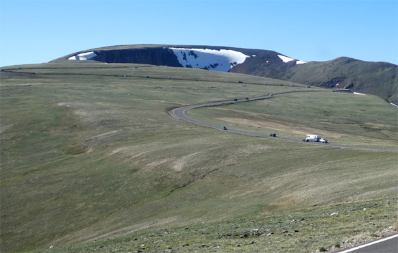 Obwohl wir uns schon fünf Tage auf über 2.000 Meter Seehöhe aufhalten, kriegen wir noch immer schwer Luft. Susi schnauft nach ein paar Schritten schon wie ein Dampfross, ich hatte schon die dritte Nacht in Folge Schlafapnoe wie damals in Tibet. Und der Zerberus? Dazu komme ich später. Wir durchfahren Denver und sind um kurz nach zwölf am Eingang des Rocky Mountain Nationalparks in Estes Park (so heißt der von Touristen überlaufene Ort am östlichen Parkeingang). Wir machen eine kleine Wanderung um den Bear Lake und durchfahren dann den Nationalpark nach Westen. Die Straße führt anfangs noch durch Kiefernwälder, steigt stetig an, und erreicht die Tundra. Problemlos bringt uns der Zerberus schließlich zur höchsten Stelle der Straße auf 3.713 Meter Höhe. Wir halten an Aussichtspunkten und genießen die spektakuläre Landschaft mit schneebedeckten Drei- und Viertausendern ringsum. Es hat acht Grad und der Wind bläst mit Orkanstärke. Dann geht es in Serpentinen hinunter zum westlichen Gate des Parks. Als es dann wieder eben wird, müssen wir leider einen Leistungsverlust des Zerberus feststellen. Zuerst denke ich, der Turbo funktioniert nicht, doch das tut er, der Wagen hat einfach nur keine Kraft. Obwohl wir ihn erst vor 19.000 Kilometern erneuert haben, vermute ich, dass der Dieselpartikelfilter durch die heutige Fahrt in großer Höhe verstopft ist. Wir übernachten in Grand Lake auf einem Parkplatz. Km 351/7.739/151.355.