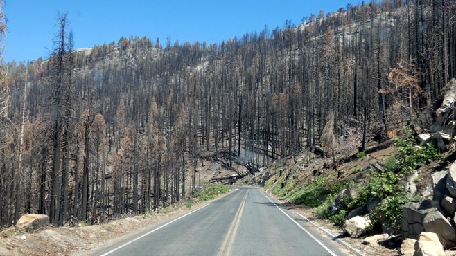 Wir durchfahren den durch etliche Waldbrände der letzten Jahre schwer geschädigten Westteil des an den Sequoia-Nationalpark angrenzenden Kings Canyon Nationalparks, dann geht es hinunter ins Tiefland, durch Fresno und wieder hinauf in die Sierra Nevada. Unser Ziel ist der Yosemite Nationalpark, der meistbesuchte und am meisten überlaufene Nationalpark der USA. Um den Ansturm einigermaßen in den Griff zu bekommen, hat man ein Reservierungssystem eingeführt, dessen Sinnhaftigkeit sich uns nicht so recht erschließt: Man muss spätestens eine Woche vor dem Besuch online reservieren (was sich natürlich mit unserem Reisestil nicht gut vereinbaren lässt), ohne Reservierung darf man zwischen sechs und 16 Uhr nicht in den Park. Nach 16 Uhr reinfahren und drin übernachten funktioniert nicht, weil die Unterkünfte einschließlich Campingplätze monatelang ausgebucht sind. Wir wollen daher morgen vor sechs Uhr reinfahren, dürfen dann so lange drin bleiben, wie wir wollen, nur schlafen dürfen wir drin nicht. Wir finden einen Übernachtungsplatz im Wald etwa einen Kilometer vor dem Gate, an dem schon einige Zelte stehen. Da es erst Mitte Nachmittag ist, beschließen wir, doch schon heute nach 16 Uhr in den Park zu fahren, um uns das kleine Freilichtmuseum in der Nähe des Parkeinganges anzusehen und einen Spaziergang zu einer Ansammlung von Mammutbäumen zu machen. Irgendwie fühlen wir uns beide müde und wir beschließen spontan, einen Rasttag im Wald vor dem Parkeingang einzuschieben. Morgen ist ohnehin Independence Day und da werden extra viele Menschen den Nationalpark besuchen und sich die Autos im Yosemite Valley stauen. Auf unserem weitläufigen Nachtplatz im Wald haben sich mittlerweile weitere Gäste eingefunden, darunter auch größere Gruppen und Familien. Es sind ganze Küchenzeilen aufgebaut und bis weit in die Nacht läuft laute spanische Rap-Musik. Km 227/11.816/155.432.