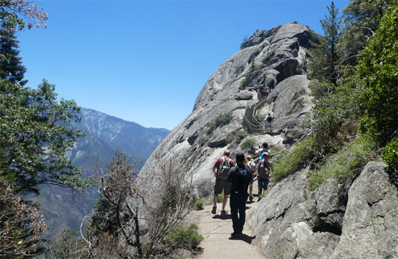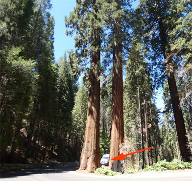 In Three Rivers gibt es eine Badestelle in einem der Zuflüsse des Sees, doch leider ist das Ufer schlammig und rutschig und so verzichten wir auf die Abkühlung. Vor dem Parkeingang des Sequoia [Seg'oija] Nationalparks hat sich schon eine lange Autokolonne gebildet, wegen eines Feiertags am Montag ist langes Wochenende, doch wir können auf einer eigenen Spur vorfahren, weil wir ja eine Jahreskarte für die Nationalparks besitzen. In vielen Serpentinen führt die Straße durch den Park in die Sierra Nevada. Von weitem sieht man einen markanten Felsen auf einem Bergrücken thronen, es ist der Moro Rock, den man besteigen kann und von dem ich einen schönen Rundumblick habe. Weil der Park total überlaufen ist, muss man in einen Shuttlebus steigen, um zu bestimmten Punkten zu gelangen. Der Park ist bekannt für die Sequoia- oder Mammutbäume, die größten Bäume der Erde (gemessen nach Volumen), die hier zwischen 1.500 und 2.100 Meter wachsen und bis zu 3.000 (!) Jahre alt werden. Der größte dieser Bäume, der General Sherman Tree, ist das größte Lebewesen der Erde. Wir übernachten außerhalb des Parks im Wald. Obwohl nur auf 1.860 Metern müssen schon eine Stunde vor Sonnenuntergang die Anoraks raus. Brrr. Km 104/11.589/155.205.