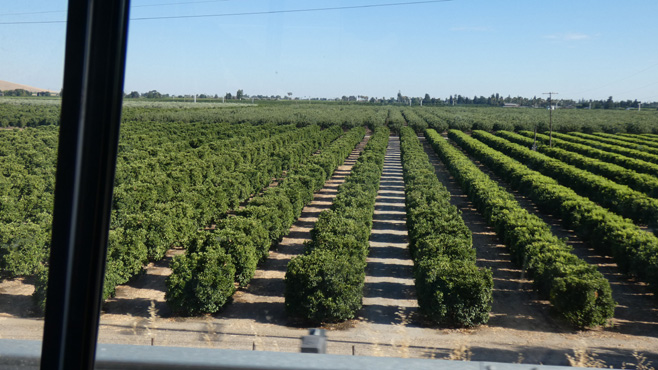 In der Früh ist es kurz ganz gut auszuhalten im Freien, doch dann setzt wieder der Föhnwind1 ein und wir sind froh, dass wir die Wüstenlandschaft des nördlichen Death Valleys aus dem Auto bestaunen dürfen. Aber immerhin klettert heute das Thermometer kaum mehr über 40. Mehrmals geht es über kleine Gebirge, bis wir die Mojave-Wüste erreichen. Hier werden mancherorts Bodenschätze abgebaut, etwa Natriumcarbonat, außerdem hat man auf vielen Quadratkilometern (!) Photovoltaikanlagen aufgestellt und andernorts viele hunderte Windräder. Es geht über einen letzten Gebirgsrücken und plötzlich ist die Wüste aus, trockenes Gras bedeckt den Boden, bald darauf sind wir in der Ebene Südkaliforniens, wo intensive Bewässerung riesige Weingärten und endlose Orangenplantagen ermöglicht. Wir umfahren die südlichen Ausläufer der Sierra Nevada, um auf deren Westseite nordwärts zu fahren. Wir übernachten mit Blick auf den Lake Kaweah, einen der Stauseen, von denen das viele Wasser für die Plantagen kommt. Km 535/11.485/155.101.