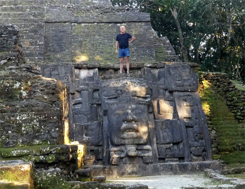 Auf mexikanischer Seite ist der Grenzübertritt unkompliziert, wenn man davon absieht, dass man sich den Zöllner suchen muss, der das TIP abschließt und eine Bestätigung über die Ausreise des Autos ausstellt. Das muss man nicht unbedingt, aber mit diesem Vorgang vermeidet man Forderungen des mexikanischen Zolls, wenn das TIP in zehn Jahren abläuft. Die Einreise nach Belize ist leicht chaotisch: Zunächst lassen sie einen bis zum Schranken vorfahren, um einem zu sagen, dass man zurückschieben, das Auto am Parkplatz abstellen und die Formalitäten in einem Gebäude erledigen muss. Das Zurückschieben ist natürlich nicht so einfach, wenn schon andere Fahrzeuge hinter einem warten. Am Immigration-Schalter gibts gleich Ärger, weil wir keinen Einreisestempel von Mexiko im Pass haben. Das hat die Mexikaner vorhin nicht gestört, aber die Belizer stört das und wir werden zur mexikanischen Grenzstelle zurückgeschickt. Die dortige Beamtin blättert in unseren Reisepässen und - unglaublich! - findet die Stempel. Sie sind kaum sichtbar, da war die Stempelfarbe wohl ziemlich aus. Nun wieder zur belizischen Grenzstelle, wo die Immigration-Officerin mault, weil man die Stempel nicht lesen kann, aber uns dann doch einreisen lässt. Nun reist auch noch das Auto ein und wird kurz von einer netten Zöllnerin angesehen. Sie interessiert sich gar nicht für unsere Lebensmittel, die man nicht einführen dürfte, sondern sieht sich die Fotos von unseren Enkelkindern an, die wir im Wohnmobil aufgehängt haben. Wir bezahlen noch die Einreisegebühr, sind nun fertig, glauben wir, und fahren wieder zum Schranken. Dort lässt man uns und alle hinter uns aber wieder zurückschieben, weil der Zerberus noch nicht desinfiziert ist. An der Desinfektionshalle im Niemandsland sind wir vorgeigefahren, weil das alle getan haben. Wer nur einen Tag nach Belize rüberfährt, braucht das nicht, wer länger bleibt, muss sich um 10 Euro besprühen lassen, erfahren wir. Wie sinnvoll! Für den triefnassen Zerberus öffnet sich nun endlich der Schranken. Wir wechseln noch Geld und schließen eine Versicherung ab. Der Grenzübertritt hat alles in allem zwei Stunden gedauert. Belize sieht auf den ersten Blick ein wenig ärmlicher als Mexiko aus, ist aber jedenfalls sauberer und ordentlicher. Es wird Englisch gesprochen, von den Geldscheinen lächelt Queen Elizabeth und die Geschwindigkeitsbeschränkungen sind in Meilen pro Stunde angegeben: im Ortsgebiet 25 (40 km/h) und außerhalb 55 (89 km/h) und alle scheinen sich daran zu halten. Die meisten fahren sogar noch langsamer, kriechen dahin, keiner scheint es eilig zu haben. Die Straße nach Lamanai, wo wir uns die Maja-Ruinen ansehen wollen, soll recht schlecht sein, meint unser Reiseführer, weswegen wir überlegen, von Orange Walk Town aus mit dem Boot dorthin zu fahren, doch heute fährt kein Boot mehr. Wir bringen aber in Erfahrung, dass die Straße über San Felipe, die zwar einen kleinen Umweg darstellt, recht gut ist. Und so ist es auch, wir kommen sogar noch so zeitig in Lamanai an, dass wir uns heute noch der Archäologie widmen können. Hier befinden sich neben verschiedenen anderen Ruinen drei Maya-Pyramiden, die von dichtem Dschungel überwuchert waren. Man hat jeweils eine Seite der Pyramiden von Bäumen befreit, aber der Urwald reicht bis dicht an die Ruinen heran, wodurch sich eine magisch-mystische Stimmung ergibt. Der Dschungel ist ein dichtes Gewirr von großen Bäumen, verschiedenen Palmen, Farnen und Pflanzen, die man bei uns als Blumenstock kaufen kann. Lianen hängen herab, Nasenbären tummeln sich und hoch oben im Geäst hüpfen Affen herum. Des spektakulärste Bauwerk hier ist die Maskenpyramide, an deren Vorderseite zwei riesige Reliefs von Köpfen prangen. Welch faszinierender Ort! Wir übernachten unweit von den Ruinen am Seeufer, ein Pärchen aus Kanada teilt den Platz mit uns. Km 187/9.257/168.213.