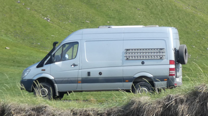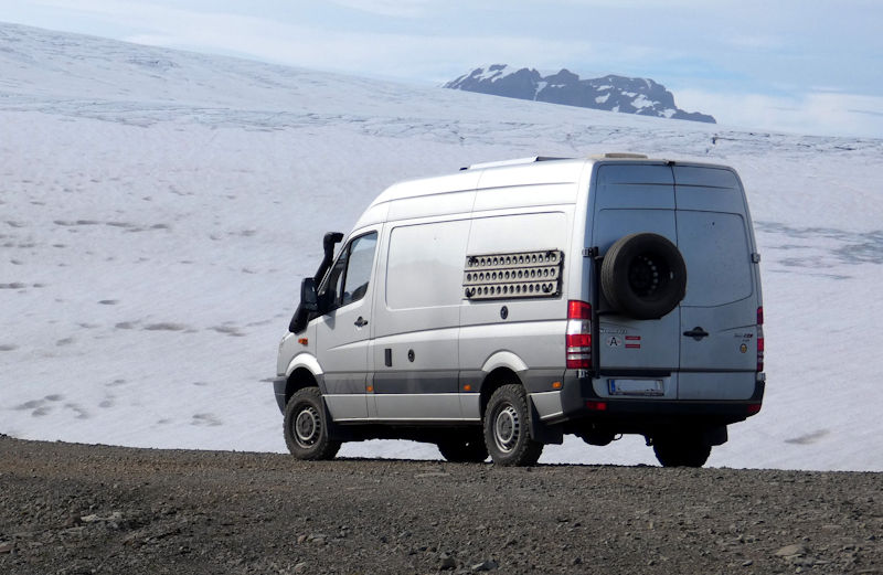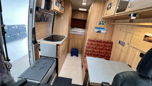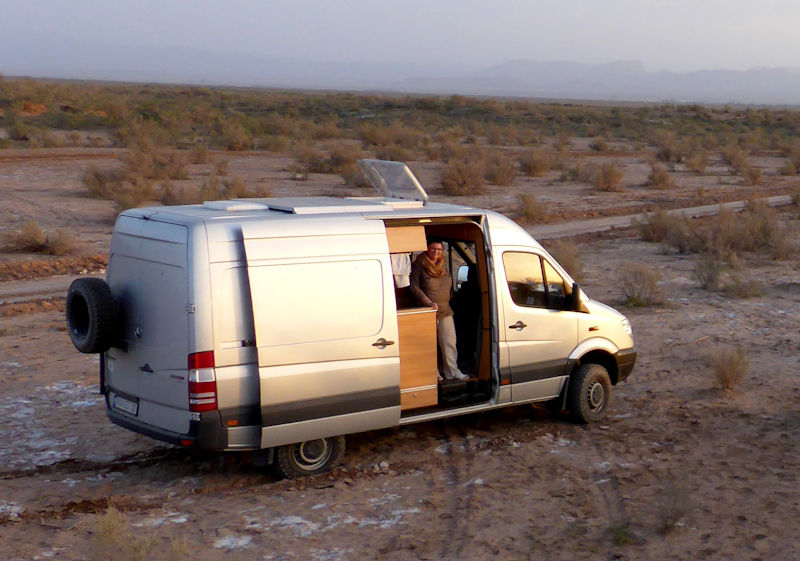 Ausbau zum Expeditionsmobil: Isolierung, Fußboden, Sitzgruppe für 2 Personen, Beifahrersitz drehbar, Tisch klappbar und auch außerhalb der Schiebetür verwendbar, Truhe unter Sitzbank, Vorratsschränke, Bücherregal, fixes Heckdoppelbett quer (140 x 180 cm) mit 2 Lattenrosten und 2 maßgefertigten Matratzen, Oberschränke, Küchenblock mit Spüle und 3-flammigem Gasherd, 11 kg Gasflasche (teilbefüllt), ausfahrbarer Kompressorkühlschrank (12 und 230 V), Campingtoilette (Porta potti), LED-Beleuchtung, 2 Dachluken mit Verdunkelung und Insektenschutzgitter, Ventilator an einer Dachluke, Verdunkelungs- und Thermomatten für Frontscheibe, Fahrer- und Beifahrerfenster, lichtundurchlässiger Vorhang hinter Fahrer- und Beifahrersitz, 2 ausziehbare Wäscheleinen, Tresor (für Pässe, Wertsachen, Laptop), 2 Wassertanks zu je 100 l (einer frostsicher im Fahrzeuginneren, einer unter der Bodenplatte nahe am Auspuff), elektrische Trittstufe für Beifahrer, Trittstufe an der Schiebetür, Handgriffe an der Schiebetür, Schiebetürhalter, Solaranlage mit 2 Paneelen, 2 Bordbatterien (zusätzlich zur Starterbatterie, mit Möglichkeit, von dort Starthilfe zu geben), externer Stromanschluss mit Ladegerät für alle Batterien, Spannungswandler (Inverter) von 12 auf 230 Volt, Spione seitlich und hinten, Airtop 2000 Diesel-Heizung, vom Bett aus steuerbar und mit Höhenschalter (über 2.500 m), Insektenvorhang und Verdunkelungsvorhang hinten, Außendusche, keine Fenster im Wohnbereich, keine Nasszelle, kein Warmwasser; Sonnensegel, Schnorchel, Luftfederung, Offroad-Licht, Zusatzdieseltank (gesamt 200 l), 2 Reserveräder, BF Goodrich All Terrain Reifen, Halterung für Sandbleche