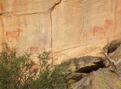 Mittwoch, 29. September 10, Tag 14, Tsodilo-Hills Nach ein paar kleineren Reparaturen fahren wir nach Maun, wo wir unsere Vorräte auffrischen, ins Internet-Cafe gehen und ein Reifenventil wechseln lassen. Leider funktioniert auch hier die botswanische SIM-Karte nicht, Susis Anrufe kommen zwar durch, aber wir hören sie nicht. In Sehitwa, wo wir von der nach Südwesten führenden Straße nach Norden abbiegen, essen wir in einem sehr einfachen Restaurant zu Mittag. Während mir das Rindfleisch mit Bohnen halbwegs schmeckt, findet Sabine ihren Maispudding mit Bohnen eher nicht so lecker. Bei einer Polizeikontrolle meint der Polizist, er müsse uns wegen der fehlenden Nummerntafel bestrafen. Ich kann ihn jedoch davon überzeugen, dass das dann aber für ihn mit viel Arbeit verbunden ist, weil er dann ja eine Verlustanzeige schreiben muss, und so vereinbaren wir, dass die Nummerntafel erst in Namibia verloren gehen wird. Auf der Weiterfahrt beschließen wir, einen Abstecher zu den Tsodilo-Hills zu machen, die etwa 40 Kilometer westlich der Straße liegen. Inmitten einer riesigen Ebene liegen vier Hügel, die wegen ihrer Felsmalereien bekannt sind. Erstaunlicher Weise müssen wir keinen Eintritt bezahlen, sondern nur die obligate Führung (50 BWP = 5,50 EUR). Unsere Führerin zeigt uns die besten Malereien. An malerischen Plätzen tummeln sich an den Felswänden Giraffen, Antilopen und Jäger, sogar Pinguine und Wale sind zu sehen. Die Führerin gibt das Alter der Malereien mit 10.000 Jahren an, während unser Reiseführer die ältesten mit 1.500 Jahren datiert. Im Vergleich mit Malereien aus der Sahara sehen sie jedenfalls sehr viel jünger aus, so dass wir eher dem Reiseführer Glauben schenken. Wir übernachten wieder im Busch, der hier ziemlich dicht ist. Erst eine Fläche, die vor einiger Zeit abgebrannt wurde, lässt uns eindringen. Hier gibt es erstmals ein Lagerfeuer. Km 509/3.989/40.454. Donnerstag, 30. September 10, Tag 15, Rundu Die Grenze nach Namibia ist schnell erreicht, die Ausreise aus Botswana erfolgt in rekordverdächtigen fünf Minuten. |