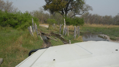 ... auf botswanischer Seite 15 Minuten (und 120 BWP = 10,84 EUR) dauern. Da unser Versuch, zwischen der Grenze und dem Chobe-Nationalpark einen Nachtplatz zu finden, scheitert, suchen wir uns ein Camp in Kasane. Wir übernachten im Thebe-Camp (S17 47.189 E25 10.972, 69 BWP = 7,64 EUR p.P.), wo wir im Restaurant ein kühles Bier trinken und dann unserem Kühlschrank viel Gin und nicht ganz so viel Tonic entnehmen. Km 283/3.049/39.514. Montag, 27. September 10, Tag 12, Chobe-Nationalpark Die Strecke durch den Chobe-Nationalpark bis Ngoma-Bridge fahren wir am Chobe-River entlang. Bei der Parkeinfahrt (S17 50.630 E25 08.560) wird das Auto desinfiziert, um das Einschleppen von Maul-und-Klauenseuche zu verhindern. Am Fluss wimmelt es nur so von Tieren: Zebras, Elefanten, Antilopen, Büffel, Gazellen und viele Vögel, etwa Löffelreiher, Adler und Geier. Von Ngoma-Bridge bis zum Gocha-Gate (S18 23.270 E24 14.720) ist die Strecke meist tiefsandig, sie begleitet zu Beginn die neue Straße, die aber noch nicht befahren werden darf, nicht einmal auf dem kurzen schon asphaltierten Teil. Die Fahrt durch den südlichen Chobe-Nationalpark hat auch dieses Mal nur wenige Tierbeobachtungen zu bieten. Heuer sind sogar die Wasserlöcher in Savuti trocken, wo sich voriges Jahr sehr viele Elefanten sammelten. Dafür messen wir hier unseren bisherigen Temperaturrekord: 39 Grad. Kurz vor Sonnenuntergang verlassen wir den Park durch das Mbabe-Gate (S19 06.016 E23 59.106) und wir übernachten auf einem schon vom Vorjahr bekannten Platz im Busch. Das Wasser in unserem unter der Bodenplatte angebrachten Wassertank hat sich im Lauf der Fahrt auf Außentemperatur erhitzt und ist zum Duschen leider zu heiß. Km 252/3.302/39.766. |