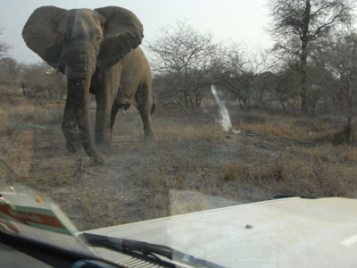 Dienstag, 21. September 10, Tag 6, Krüger-Nationalpark Wir stehen schon um 5 Uhr 30 auf, um bei Sonnenaufgang an den ersten Wasserstellen zu sein. Das lohnt sich, denn wir treffen an einer Brücke über einen wenig Wasser führenden Fluss auf zwei Büffel. Kurz darauf steht am Wegrand ein riesiger Elefant, dahinter im Busch weitere. Auch auf der anderen Seite der Straße stehen Elefanten. Sind wir etwa mitten in eine Herde geraten? Es scheint ganz so, denn der Bulle, den wir als erstes gesehen haben, geht auf der Straße auf uns zu. Zunächst finden wir das noch recht toll, doch als er dann nur mehr zwei Meter neben dem Auto steht und die Ohren abspreizt, durchfährt uns ein mächtiger Adrenalinstoß und wir entschließen uns zur Flucht per Vollgas. Im Verlauf des Vormittages sehen wir dann noch die üblichen Tiere, gegen Mittag immer weniger und als wir glauben, alle haben sich in der Mittagshitze verdrückt, entdecken wir im Schatten eines Baumes zwei Breitmaulnashörner. Dann treffen wir bei einem Wasserloch auf ein Krokodil, das mit einer Schildkröte schäkert. Und am frühen Nachmittag gibt es ein weiteres Highlight: Ein paar Löwen räkeln sich genüsslich in der Sonne. Im Satara-Camp (S24 23.580 E31 46.779) duschen wir (erstaunlicherweise gibt es keinerlei Zugangskontrollen) und etwa eine Stunde vor Sonnenuntergang verlassen wir den Park. Etwas außerhalb finden wir eine Piste weg von der Parkzufahrt in den Busch. Sie führt an ein großes Wasserloch, an dem ich gerne übernachtet hätte. Doch Sabine findet in Anbetracht der vielen Tierspuren und -exkremente (auch von Elefanten) die Idee nicht so gut, weshalb wir uns auf einen Platz etwa 200 Meter neben der Wasserstelle einigen. Ganz glücklich ist Sabine noch immer nicht, liegt doch auch hier überall Elefantenkacke und eine große Herde Springböcke und ein paar Zebras sind in Sichtweite. Wild campieren im Busch geht halt nicht anders. Km 248/935/37.400.