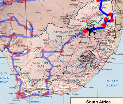 ... Johannesburg gebucht haben. Freitag, 17. September 10, Tag 2, Johannesburg Am Morgen stellt meine tastende Zunge fest , dass die erst gestern erhaltene Füllung meiner Zahnwurzel fehlt. Die habe ich vermutlich beim Abendessen versehentlich verschluckt. Ein Taxi bringt uns vom Flughafen zum Self-Storage, wo wir unseren Toyota liebevoll begrüßen. Zwei Reifen ist während der neunmonatigen Stehzeit die Luft ausgegangen; gut dass wir das Buschtaxi aufgebockt haben. Ich schließe alle vier Batterien an und - kaum zu glauben - der Toyo springt sofort an. Doch ein lautes Quietschen verdirbt uns die Freude. Die Lichtmaschine dreht sich nicht und darum rutschen die Keilriemen an der Rolle. Ein paar Spritzer Universalspray beheben das Problem sofort und wir können nun die beiden drucklosen Reifen aufpumpen. Dann nehmen wir das Auto von den Böcken, laden unser Gepäck ein und sind reisefertig. Im Büro des Self-Storage wollen wir noch die Kaution für die Garage beheben, doch die haben nicht 370 Rand (41 EUR) Bargeld und wir müssen einen Scheck nehmen. Im nahe gelegenen Spar ergänzen wir die Vorräte im Auto und dann fahren wir auf den am Stadtrand gelegenen Campingplatz "Country-Park" (S26 03.477 E27 52.835, Auto + 2 Pers. 140 ZAR = 15,50 EUR), wo wir voriges Jahr schon einmal übernachtet haben. Wir sind die einzigen Gäste und genießen die Ruhe beim Ein- und Umräumen. Sabine ist kurz beunruhigt, als plötzlich und ohne erkennbare Ursache ihre Oberlippe anschwillt. Sie kriegt ein Antihistaminikum, mit dem die Sache bis morgen Abend erledigt sein wird. Kaum geht nach dem heißen Nachmittag die Sonne unter, wird es auch schon empfindlich kalt und nach dem Abendessen sitzen wir schon in Anoraks beim Glühwein. Km 8/8/36.473. Samstag, 18. September 10, Tag 3, Johannesburg Beim Frühstück fällt uns auf, dass der Tau auf unserem Reservereifen Blasen bildet: Ein Leck, das wir im Auge behalten werden. Unser erster Weg führt uns noch einmal in einen Supermarkt und dann geht es ab ins Zentrum von Johannesburg. Wir finden einen gut gesicherten Parkplatz vor dem Museum Africa (S26 12.15 E28 1.87). Das Museum (Eintritt frei) ist weit weniger faszinierend als der Reiseführer verspricht. Schon nach kurzer Zeit sind wir auf dem Weg zum Carlton-Tower (15 ZAR = 1,67 EUR p.P.), von wo man einen tollen Ausblick auf die riesige Stadt hat. Wir sehen uns im Vorbeigehen noch die St. Mary's Cathedral, the Old Post Office und die Town Hall an, wobei es den Anschein hat, dass wir die beiden einzigen Weißen in der Stadt sind. Da ist es dann auch fast kein Wunder, dass ich Opfer eines Versuchten Raubes werde: Ein Schwarzer versucht, mir das Bauchtascherl zu rauen, wo zwar ohnehin nichts Wertvolles drin ist. Doch ich kann die Wegnahme aber verhindern. Den Abschluss der Stadtbesichtigung bildet der Besuch der World of Beer (30 ZAR = 3,33 EUR p.P.). Nach der Führung und je einem kleinen Bier verschenken wir schweren Herzens die weiteren Biergutscheine. Wir müssen ja noch fit bleiben für die Ausfahrt aus der Millionenstadt. Erst kurz vor Sonnenuntergang verlassen wir die Autobahn bei Belfast und finden erst in der Dunkelheit einen halbwegs brauchbaren Nachtplatz neben einer Bahnlinie. Die Nacht ist sternenklar und wieder anorakkalt. Km 317/325/36.790. |
