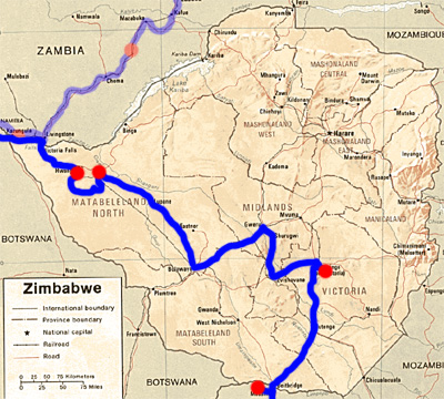 Samstag, 25. September 10, Tag 10, Hwange-Nationalpark Gleich in aller Früh legen wir die paar Kilometer bis zum Main-Gate (S18 43.836 E26 57.058) des Hwange-Nationalparks zurück. Wir bezahlen 20 USD (15,8 EUR) p.P. und 5 USD (4 EUR) für's Auto. Der Park ist noch sehr naturbelassen, nur wenige Pistenabschnitte sind (schlecht) asphaltiert, man kann auch näher zu den Wasserstellen zufahren als im Krüger-Nationalpark. Obwohl wir eine sehr ausgiebige Pirschfahrt unternehmen, bekommen wir nur relativ wenige Tiere vor die Linse; von Raubkatzen sehen wir nur die Spuren im Sand. Auch wenn wir gelegentlich an größeren Elefantengruppen vorbeikommen, ist es nur schwer zu glauben, dass im Park 20 - 30.000 Dickhäuter leben sollen. Wir sehen aber einen Strauß, einen Adler und verschiedene andere uns unbekannte Vögel. Wieder übernachten wir im Busch, etwas außerhalb des Sinamatella-Gates. Km 356/2.766/39.231. Sonntag, 26. September 10, Tag 11, Victoria-Falls Unser erster Weg in Victoria führt uns an die Fälle (30 USD = 23,70 EUR p.P.). Obwohl während der Trockenzeit der Sambesi wenig Wasser führt, sind die Fälle spektakulär. Auf dem Weg bis zur Brücke über den Sambesi, von dem sich Bungee-Jumper in die Tiefe stürzen, bieten sich immer wieder tolle Ausblicke. Victoria ist ein unerwartet kleines Nest, in dem wir nicht einmal ein Restaurant finden, das uns ein Steak serviert. Wir essen schon wieder in einem Chicken-Fastfood-Restaurant. Unsere Bemühungen um einen Hubschrauberflug sind leider vergeblich, bis morgen sind alle Flüge ausgebucht. Wir verlassen daher Victoria in Richtung Kazungula, wo die Grenzformalitäten auf zimbabwischer Seite ca. 5 Minuten, ... |