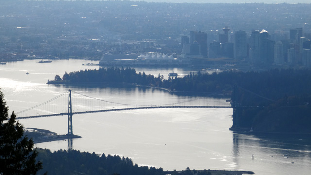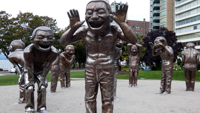Nach einem Spaziergang zu den Shannon Falls fahren wir auf den Cypress Mountain, von wo man einen schönen Blick auf das jenseits des Burrand Inlet gelegene Vancouver hat. Die über das Inlet führende Lion's Gate Bridge erinnert stark an die Golden Gate Bridge und führt zum auf einer Halbinsel gelegenen Stanley Park, der vier Quadratkilometer großen grünen Lunge Vancouvers. Unser erstes Ziel ist aber die English Bay, deren Strand mit Palmen überrascht. Hier steht auch eine Gruppe von zehn oder 15 überlebensgroßen Statuen lachender Männer. Die bringen einen ebenfalls zum Lachen, das lässt sich gar nicht vermeiden. Wir machen nun einen Spaziergang um den Canada Place, die Anlegestelle für Kreuzfahrtschiffe, die mit ihren nachempfundenen Segeln an die Oper in Sydney erinnert. Der Hafen von Vancouver ist insofern ungewöhnlich, als hier auch unzählige Wasserflugzeuge starten und landen. Für einen Blick auf die Skyline Vancouvers fahren wir mit einer öffentlichen Fähre auf die andere Seite des Burrand Inlets und mit dem gleichen Boot wieder zurück. In der Nähe des Canada Place befindet sich die Steamclock, eine dampfbetriebene Uhr, die stündlich ein Liedchen pfeift. Wir fahren noch durch die Mainstreet und Chinatown und machen zum Abschluss des Tages einen ausgedehnten Spaziergang im Stanley Park. Km 158/10.512/123.117.