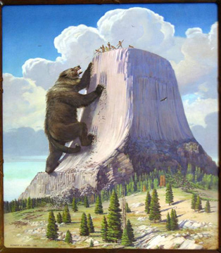 In meiner Kindheit bekam ich dann und wann ein Micky-Maus-Heft. Damals waren in der Mitte immer ein paar Seiten mit interessanten Artikeln aus aller Welt drin. An einen kann ich mich gut erinnern, denn das dazugehörige Bild hat mich sehr beeindruckt: Auf einem großen, turmähnlichen Felsen standen Indianer, die von einem Grizzlybären bedroht wurden, der fast so groß wie der Felsen war und dessen Krallen Rillen in den Berg zogen. Als ich später Fotos vom Ayers Rock gesehen habe, dachte ich, es wäre dieser Felsen, doch als ich neulich in Australien war, musste ich feststellen, dass es da gar keine Grizzlys gibt ;-) Und heute steht plötzlich genau dieser Felsen aus meiner Kindheit vor uns: Der Devil's Tower. Grizzly ist keiner da und auch Indianer stehen nicht oben, aber man sieht noch die Kratzspuren des Bären als vertikale Rillen im Fels und das Beste: Im Souvenirshop verkaufen sie allerlei Zeugs mit genau dem Bild drauf! Der Felsen erhebt sich 265 Meter aus der Landschaft, an seinem Fuß haben religiöse Indianer farbige Stoffstreifen an die Bäume gebunden. Die ersten Besteigungen erfolgten über eine Holzleiter, die man jetzt, 125 Jahre später, noch mit einem Fernglas erkennen kann! Und noch eine Story erfährt man auf dem Rundgang um den Felsen: In den 40er-Jahren ist ein Fallschirmspringer auf dem Devil's Tower gelandet, hat aber sein Seil verloren, mit dem er sich abseilen wollte, und musste sechs Tage auf seine Rettung warten. Dumm gelaufen!