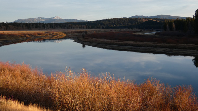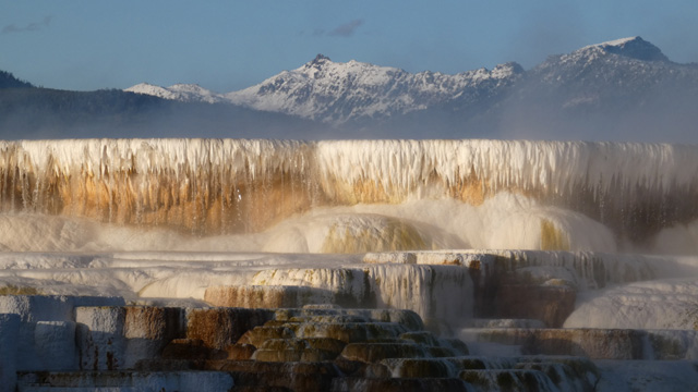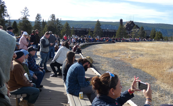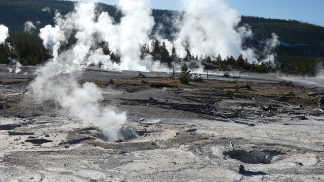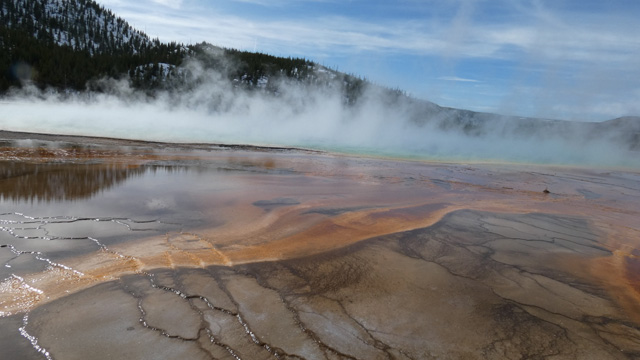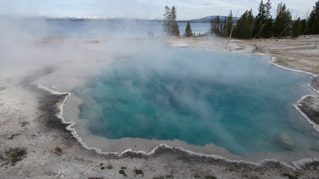 Der Yellowstone Nationalpark ist nicht umsonst einer der bekanntesten und meistbesuchten Nationalparks der Welt. Er liegt auf über 2.000 Metern Seehöhe. Überall raucht1 und pfaucht, pfufferlt2, brodelt, köchelt und blubbert es. Wir durchfahren den Nationalpark von Nord nach Süd und halten an den sehenswertesten Stellen, etwa am Norris Geyser Bassin. Vor dem Steamboat Geyser haben es sich ein paar Geysir-Fanatiker auf Campingstühlen bequem gemacht, die Kameras auf den Stativen. Manche sitzen schon tagelang da und warten auf die nächste Eruption. An einer Tafel ist die letzte mit 7. Oktober vermerkt. So viel Geduld haben wir nicht, aber die Dampfsäule ist auch ohne Fontäne ganz ansehnlich. Am Old Faithful Geyser haben wir mehr Glück. Hier warten schon hunderte Menschen auf den nächsten Ausbruch und kaum sind wir da, schießt der Geysir etwa eine Minute lang haushohe Fontänen in die Luft. Im Süden grenzt der Yellowstone direkt an den Grand Teton Nationalpark. Die Straße verläuft auf einem Hochplateau entlang der schneebedeckten Kette der Teton Mountains. Am Oxbow Bend spiegeln sich die Berge im Snake River, Wasservögel und Otter tummeln sich. Km 224/13.832/126.436.