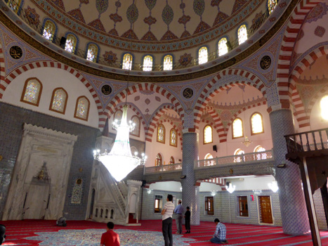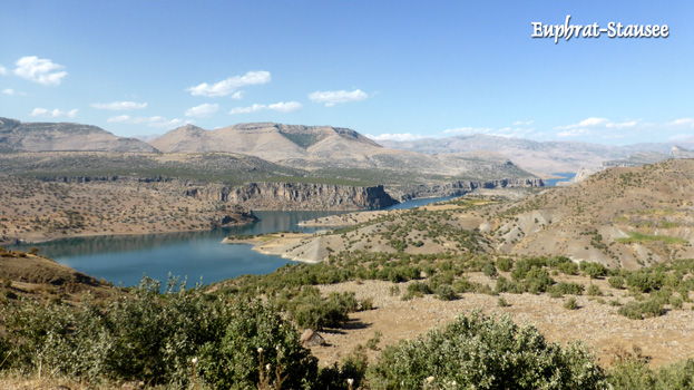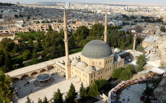Gleich in aller Früh steige ich nochmals auf den Nemrut, um auch die Figuren auf der Ostseite im Sonnenlicht zu sehen. Ein ziemlich kühles Winderl weht mir dabei um die Ohren. Am Euphrat-Staudamm (N37 28.165 E38 18.749) trinken wir einen Kaffee. Kurz vor Sanliurfa besichtigen wir die prähistorische Ausgrabungsstätte Göbekli Tepe, wo teilweise mit Reliefs verziert etwa T-förmige Steinplatten, offensichtlich Menschen symbolisierend, im Kreis stehen. Die Ausgrabung ist noch im Gange, vermutlich ist nur ein Bruchteil der Stätte entdeckt. In Sanliurfa essen wir in einem vornehmen Restaurant zu Mittag, wobei wir langsam so grundlegende Dinge wie Kartoffeln oder Reis zu vermissen beginnen. Dann dauert es eine ordentliche Weile, bis wir die Hali Rahman Camii finden. Ein Parkplatz in der Nähe, noch dazu für unseren Riesen, ist sowieso ausgeschlossen. Aber es kommt uns die rettende Idee: Wir fahren auf die Festung, dort gibt es keinerlei Parkplatznot, außerdem haben wir den obersupertollen Blick auf die Stadt und zur Draufgabe gibt es einen Spazierweg hinunter zur Moschee. Neben dieser befindet sich die Grotte, in der angeblich Abraham geboren wurde. Die Abrahamsgrotte zieht tausende von Pilgern an, die sich im Hof davor und im riesigen Park vor der Moschee mit dutzenden Cafes tummeln und die Fische in Abrahams Teich füttern. Mit dem Taxi geht es zurück auf die Festung. Km 300/6.537.