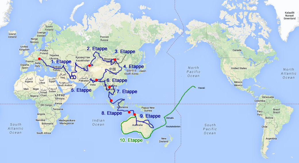 Die zehnte Etappe unserer Weltreise führt uns von Darwin im Norden Australiens gegen den Uhrzeigersinn bis Sydney im Südosten. Dann sagen wir dem fünften Kontinent auf Wiedersehen und verschiffen den Zerberus. Das Wohin war Gegenstand langer Überlegungen und Diskussionen. Für das zuerst angedachte Neuseeland müssten wir unser Wohnmobil erneut einer Putzorgie unterziehen. Also weiter nach Südamerika! Leider gibt es aber keine direkte Roro-Verbindung von Australien nach Südamerika. Man müsste daher das Auto umladen, typischer Weise in Panama. Dabei würde der Zerberus allerdings bis zum Eintreffen des zweiten Schiffes auf dem Hafen herum stehen und tage- oder sogar wochenlang Neugierigen und Langfingern Objekt der Begierde sein. Da es bei der Verschiffung in Hinblick auf die Kosten egal ist, ob die Umladung in Panama, Seebrügge oder Bremerhaven statt findet, haben wir uns entschieden, unser Auto nach Europa transportieren zu lassen und die Weltreise ein Jahr zu pausieren. 2019 geht es dann nach Amerika. Während unser Fahrzeug mit dem Frachter Parsifal Pazifik und Atlantik überquert, möchten wir uns das eine oder andere Südseeparadies ansehen und besteigen dazu erstmals ein Kreuzfahrtschiff. Nein, keine Alterserscheinung, sondern eine Notlösung: Wir buchen Restplätze auf einer Kreuzfahrt nach Vanuatu und Neukaledonien, weil über die Feiertage keine Flüge und Hotels zu kriegen sind. Von Sydney nach Hause fliegen wir nicht zurück nach Westen, sondern weiter nach Osten und machen kurz Station auf Hawaii.  Weltreise in der Weltreise quasi.