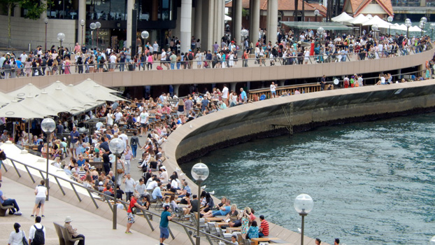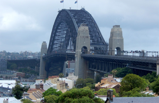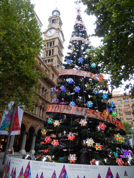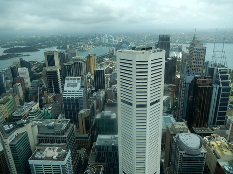Mit dem Zug fahren wir nach Sydney. An einem Sonntag kann man um unglaubliche 2,50 AD (1,70 EUR) alle öffentlichen Verkehrsmittel im Großraum den ganzen Tag lang benützen. Wir sehen uns St. Andrew's Cathedral, Town Hall und das Queen Victoria Building an, ein elegantes Kaufhaus im viktorianischen Stil mit 200 teuren Geschäften. Wir fahren auf den Sydney Tower und blicken aus 250 Metern Höhe auf die Stadt, besteigen den Observatory Hill, einen kleinen Hügel mit Sternwarte an der Harbour Bridge und gehen ein Stück auf dem Fußweg auf der Brücke, von wo man gut auf den Hafen sieht. Durch das alte Hafenviertel The Rock schlendern wir bis zur Oper. Das beste überhaupt an unserer Stadtbesichtigung aber ist eine Fahrt mit einer Fähre, die noch dazu in unserem Bahnticket inbegriffen ist, vorbei an einem riesigen Kreuzfahrtschiff, der Harbour Bridge und der Oper auf die andere Seite des Hafens und zurück. Phantastisch! Via State Library und dem unscheinbaren Parlamentsgebäude geht es zum Martins Place, wo Sydneys riesiger Christbaum steht und wo wir wieder in den Zug zurück nach Kogarah steigen. Wir übernachten nochmals auf dem Sportplatz. Km 9/14.425/90.190.