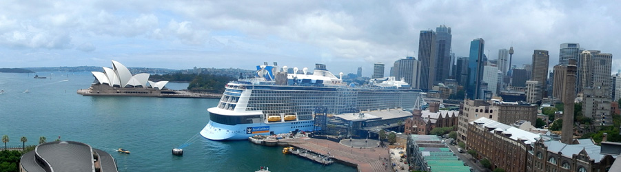 Ich setzte zunächst Susi mit unserem Gepäck am Bahnhof in Port Kembla ab und fahre dann zum Hafen. Ich stelle den Zerberus am zugewiesenen Parkplatz ab und muss ihn unversperrt mit dem Schlüssel auf dem Fahrersitz zurück lassen. Das Wohnmobil ist wie vorgeschrieben "blickleer", das heißt, es liegt oder steht nichts rum, sondern es ist alles in Schränken verstaut. Viele der auf dem Transport verbotenen Gegenstände haben wir in unsere Reisetaschen gepackt, verschenkt oder entsorgt: Lebensmittel, Putzmittel, Schmierstoffe, elektronisiche Geräte, sogar die leere (!) Gasflasche musste weg, Die angekündigte diesbezügliche strenge Kontrolle findet nicht statt. Oder kommt sie erst, bevor jemand das Auto auf das Schiff fährt? Ich gehe zu Fuß zum Bahnhof und wir fahren mit dem Zug nach Sydney. Leider erwischen wir dann die falsche Fähre und landen in Balmain anstatt in Balmain East. Das ist jetzt kein so großes Problem, der Fußweg zum Anlegestelle unseres Schiffes ist nur ein wenig länger. Leider leitet uns Google Maps dann noch fehl und wir müssen nach lamgem Gehen mit all unserem Gepäck feststellen, dass der Weg nicht weiter geht. Eine freundliche Anrainerin, die uns ein wenig ratlos stehen sieht, meint, das passiere hier jeden Tag, und bringt uns mit ihrem Auto zum Cruise Terminal. Km 21/14.993/90.758.