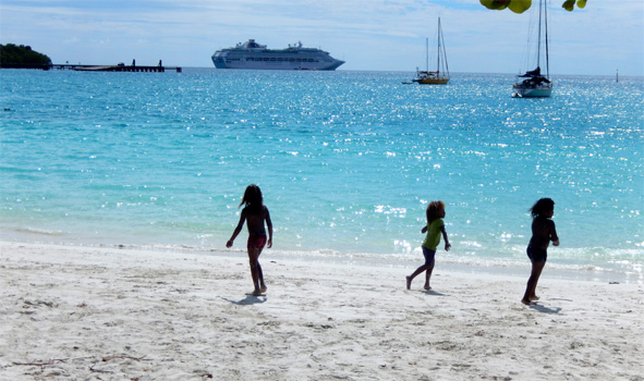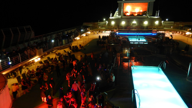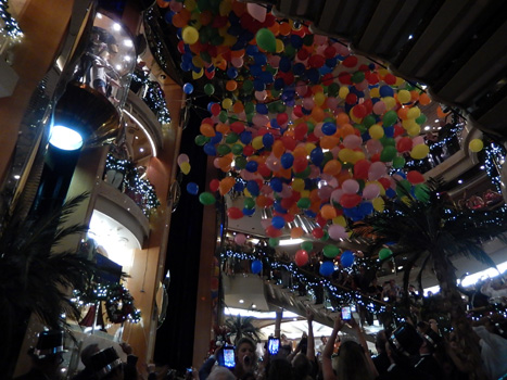 Wir verbringen den Tag unverständlicher und unnötiger Weise auf See. Zwischen Lifou und Ile des Pins liegen nur 200 Kilometer, eine Strecke die wir locker über Nacht zurücklegen könnten. Doch wir fahren weit an Ile des Pins vorbei und in der Nacht in einer großen Schleife wieder zurück. Weil mir an der Rezeption niemand den Grund dafür nennen kann, lasse ich beim Kapitän anfragen. Ich glaube eher nicht, dass da je eine Antwort kommt. Leider gibt es kein so tolles Silvesterprogramm, es spielt halt überall eine andere Musik, in den Boutiquen präsentieren sie neue Kollektionen, aber wir hätten uns sowas wie eine Show erwartet. Feuerwerk gibt es auch keines, das wundert uns sehr, aber vielleicht hat's was mit Ökologie zu tun, weil der Mist ja ins Meer fällt. Sie übertragen das Feuerwerk aus Sydney, das schon um halb elf startet, via Satellit auf's Open Air Kino. Daneben spielt eine Band mit Musikern aus der Karibik, im Atrium eine Jazzband. Ganzen Tag schon wurden Luftballons aufgeblasen, die um Mitternacht von der Decke fallen. So richtig Stimmung kommt aber nicht auf, die Szenen erinnern irgendwie an Cartoons von Loriot oder Haderer, auf denen Leute mit lustigen Faschingshüten fadisiert herumsitzen. Gleich nach Mitternacht laufen alle in ihre Kabinen. Wir auch.