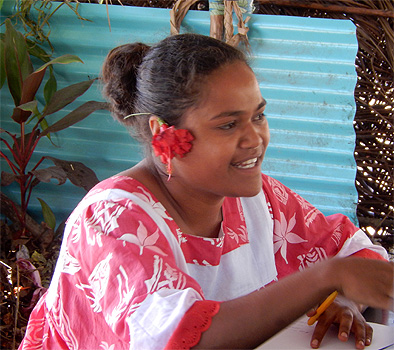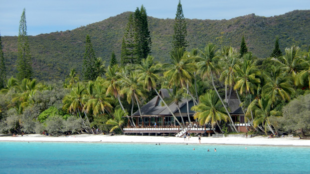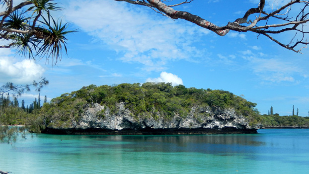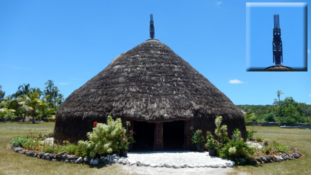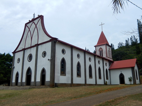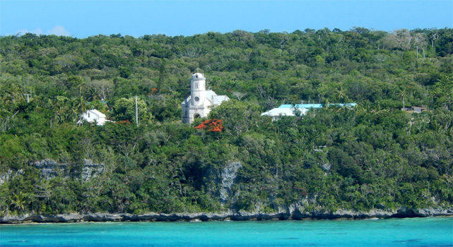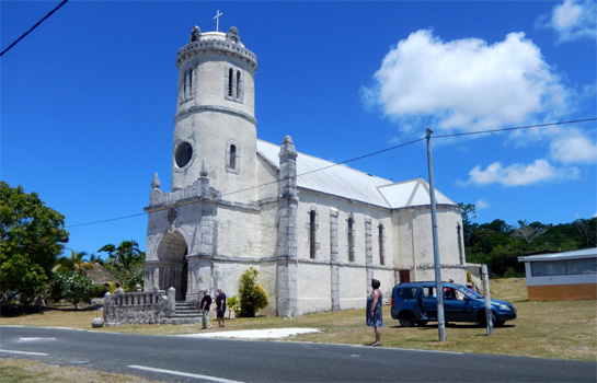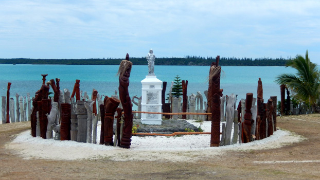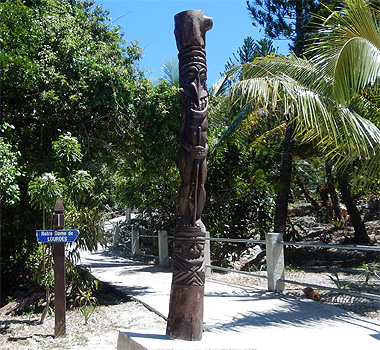 James Cook nannte die etwa 15 mal 15 Kilometer große Insel nach den vielen an Kiefern erinnernden Bäumen Pinieninsel. Wir finden ja, dass die Araukarien eher Zypressen ähneln, es handelt sich jedenfalls um sehr hohe schlanke dunkelgrüne Bäume, wobei ich unsicher bin, ob es wirklich Nadelbäume sind. Wir nehmen an einer zweistündigen Inselrundfahrt teil, die uns zunächst in das einzige Dorf der Insel, Vao, führt, wo sich eine hübsche Missionskirche befindet, die auch heute noch die Hauptkirche der Insel ist. Am Dorfrand erinnert ein am Meer gelegenes Denkmal an die ersten Missionare. Es ist von geschnitzten Totempfählen umgeben. Am Andern Ende der Insel zeugen Gefängnisruinen von der düsteren Vergangenheit, als man politisch Gefangene aus Frankreich hierher deportierte. In der Nähe des Bootsanlegers liegen zwei Buchten, Kuto Bay und Kanumera Bay, hyperbelartig beieinander, die eine bezaubert durch feinen hellen Sand, in der anderen befindet sich eine kleine Insel, die man schnorchelnd umrunden kann.