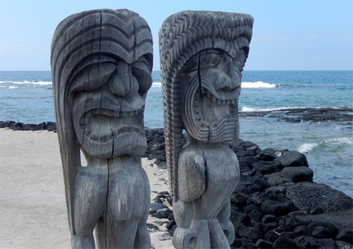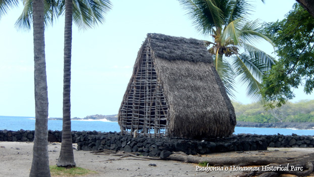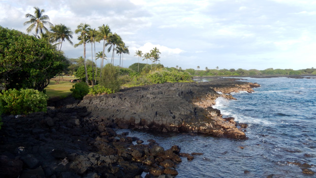 Über die Saddle Road fahren wir zurück nach Kona, um die Küste südlich davon zu erkunden. Es soll hier zwei tolle Buchten zum Schnorcheln geben, doch in der Kealakekua Bay ist die Brandung so stark, dass man sich nicht ins Wasser traut. Es sind außer ein paar Bier trinkenden Hippies keine Leute da. Und in Honaunau Bay ist das Wasser, abgeschirmt durch ein Riff, zwar ruhig, aber es sind so viele Leute, da, dass wir gleich wieder flüchten. Vorbei an Kaffeeplantagen am Fuß des Mauna Loa geht es zum Puuhonua o Honaunau National Historical Parc an, in dem sehr nett die königlichen Hofanlagen (in Form von Steinpodesten mit Hütten drauf) nachgebildet wurden. Wir umfahren den Südteil der Insel, auf dem sich der südlichste Punkt der USA befindet, und entdecken einen fast menschenleeren sehr schönen Lavastrand mit Palmen, an dem wir eine schöne Zeit verbringen. Zurück zum B&B fahren wir an die zwei Stunden. Man unterschätzt die Entfernungen auf der Insel. Nicht umsonst heißt sie Big Island.