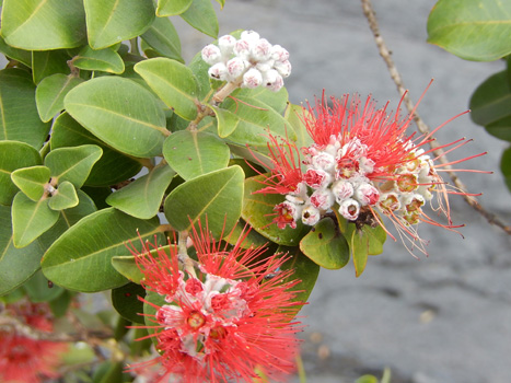 Wie alle Inseln Hawaiis ist auch Big Island vulkanischen Ursprungs. Besonders deutlich zeigt sich das um Kilauea an der Ostspitze der Insel, wo Lavamassen verschiedenen Alters das Bild prägen: Während über die älteren schon wieder Bäume gewachsen sind, wachsen aus der Lava von 1960 nur Bäumchen und aus jener von 1983 nur Farne und Gräser. Was sich hier abgespielt hat, demonstrieren die teils gruseligen Fotos hier1. Am Nachmittag fahren wir zum Halemaumau, einem der zur Zeit aktivsten Vulkane weltweit. Es ist kein Berg, sondern ein Plateau mit einem Krater von etwa vier Kilometern Durchmesser, in dem ein zweiter Krater von knapp einem Kilometer eingesunken ist, aus dem es raucht und dampft. Auf den bis zum Meer abfallenden 15 Kilometern ist alles von schwarzer Lava verschiedenen Alters übersät. Eine Asphaltstraße führt durch das Gebiet und zu verschiedenen Aussichtspunkten. An einer Stelle kann man durch eine mehrere Meter hohe und vielleicht 200 Meter lange Lavaröhre gehen. An anderen Stellen tritt häufig aus Nebengängen glühendes Magma aus, das zischend und dampfend ins Meer fließt, zuletzt vor zwei Wochen. Dieses Schauspiel zu sehen, ist uns nicht vergönnt. Als es dämmert, fahren wir zurück zum Krater, der nun in der Dunkelheit leuchtet wie der Eingang zur Hölle.