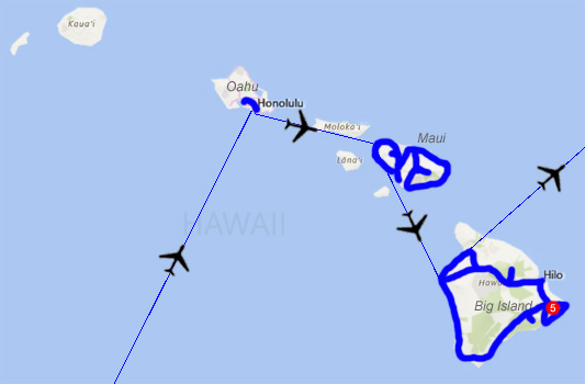 Hawaii Island ist klimatisch zweigeteilt, Während im Westen fast immer die Sonne scheint, gehört der Osten, also die Gegend, in der unsere Unterkunft gelegen ist, zu den Orten mit dem meisten Niederschlag weltweit. Hier ist der Himmel meist von dunklen Wolken bedeckt, es regnet mehrmals täglich und es ist daher immer feucht. Die vielen Vögel des Regenwaldes lassen einen nachts nicht einschlafen, dafür weckt einen der zum B&B gehörende Hahn eine Stunde vor Sonnenaufgang. Sehr rustikal. Wir fahren heute die nördliche Küstenstraße entlang, die durch üppige Wälder führt und nur selten den Ausblick auf die Steilküste mit wilder Brandung freigibt. Vor Waimea gibt es dichten Nebel, der sich dann plötzlich lichtet und auf einmal ist es wolkenlos sonnig. In Kailua Kona machen wir einen Spaziergang entlang der Uferpromenade, sitzen eine Weile in einem Park und sehen abends am Magic Sands Beach den Surfern zu. Der Flughafen in Kailua Kona ist ungewöhnlich: Das Flughafengebäude besteht großteils nur aus Dächern, der Check-in-Bereich und die Gates haben keine Wände, man sitzt fast im Freien, es geht ein warmes Lüfterl, jeder schwitzt und niemand wird von einer Klimaanlage krank.
