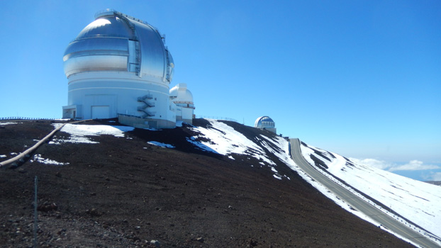 Pünktlich um acht erscheinen wir zum Frühstück, doch außer Kaffee ist nichts fertig. Nach und nach treffen auch die anderen Gäste des B&B ein und nach und nach kommen dann auch Saft, Müsli, Brot und Eierspeise auf den Tisch, aber so langsam, dass wir erst um halb zehn mit dem Frühstück fertig sind! Heute wollen wir auf den Mauna Kea, den mit 4.205 Metern höchsten Berg im Pazifik, fahren. Von der Saddle Road geht es durch Lavafelder stetig bergauf. Dann staunen wir aber nicht schlecht, als nach etwa einem Drittel der Zufahrt der Asphalt endet und ein Schild die Weiterfahrt nur mit Allrad und Untersetzung erlaubt, haben wir doch bei Google Earth gesehen, dass die den Gipfel erreichende Straße asphaltiert ist. Da sich die Straße in gutem Zustand befindet, fahren wir weiter. Die teilweise enorme Steigung und das Wellblech bringen unseren PS-schwachen Wagen gehörig ins Schwitzen. Wir kommen nur hinauf, weil ich die Automatik ausschalte und links fahre, wo weniger Wellblech ist. Kurz vor dem Ziel ist wieder asphaltiert. Auf dem schneebedeckten Gipfel befindet sich eine astronomische Forschungsstation mit mehreren Sternwarten und Teleskopen. Es hat 12 Grad und ist ziemlich windig. Wir blicken auf etliche kleinere Vulkankegel, den ebenfalls schneebedeckten Nachbarvulkan Mauna Loa und auf eine geschlossene Wolkendecke unter uns. Am Nachmittag sehen wir uns Hilo, die größte Stadt im Osten der Insel an. Wir spazieren durch den japanischen Garten und auf das durch eine Fußgängerbrücke erschlossene Cocunot Island (so groß wie eine Kokosnuss).