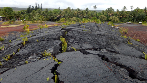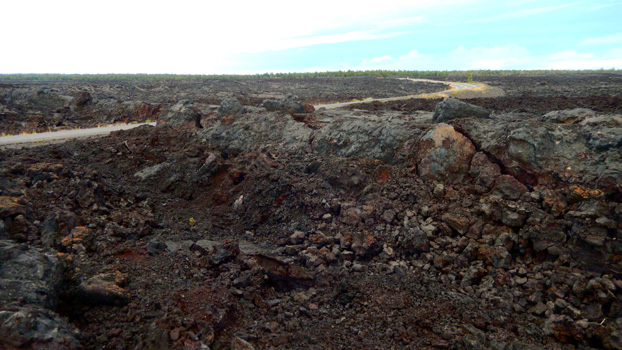Wir haben einen Mietwagen reserviert, doch die Verleihfirma gibt es hier nicht, kennt niemand. Anrufe bei der Firma und beim Buchungsportal landen auf einem Tonband. Erst ein engagierter Mitarbeiter von Avis findet heraus, wer unseren Wagen hat. Wir queren nun die Insel von West nach Ost auf der Saddle Road, die so heißt, weil sie über den 2.000 Meter hohen Sattel zwischen den beiden Vulkanen Mauna Kea und Mauna Loa führt. Es ist schon dunkel, als wir Pahoa erreichen, wo wir ein halbwegs günstiges 4-Sterne-Hotel gebucht haben. Das GPS führt uns außerhalb des Ortes in eine kleine, unbeleuchtete Seitenstraße, die nach ein paar hundert Metern zu einem Feldweg wird. Das kann wohl nicht stimmen. Doch da steht ein handgemalter Wegweiser. Wir fahren noch ein Stück weiter, es ist völlig dunkel, weit und breit kein Licht zu sehen. Das Navi sagt: noch 300 Meter. Plötzlich stehen wir vor einem verschlossenen Tor, an dem zwei grüne Leuchtstoffröhren ein wenig Licht machen. Das Tor ist mit einem Vorhangschloss gesichert, es gibt keine Klingel, hinter dem Tor scheint ein Park zu sein, es gibt keinen Hinweis auf ein Hotel. Ich rufe das Hotel an und man sagt mir einen Zifferncode, mit dem ich das Vorhangschloss öffnen kann. Nach ein etwa zweihundert Metern dann endlich ein Haus. Das Vier-Sterne-Hotel entpuppt sich als Bed-and-Breakfast. Sehr sauber zwar, aber unser Zimmer ist klein, einfach und ohne Features wie Klimaanlage, Safe, Fön, dafür mit Gemeinschaftsbad/WC. Ich mache einen Aufstand und erreiche, dass wir ein Zimmer mit eigenem Bad/WC bekommen. Allerdings gegen Aufpreis. Was soll's, es ist ohnehin zu spät, etwas anderes zu suchen.