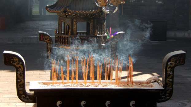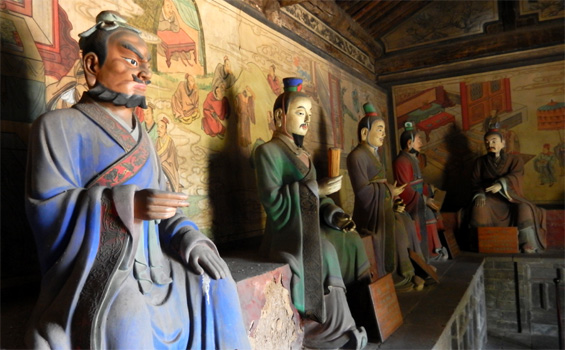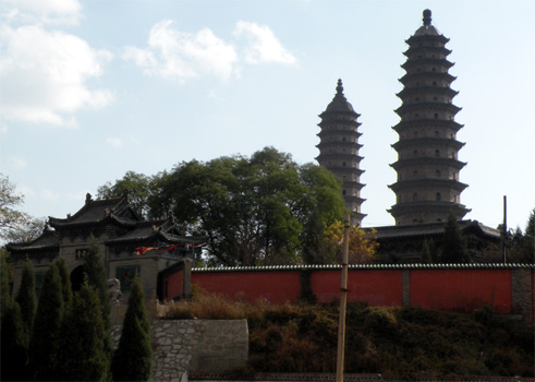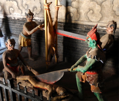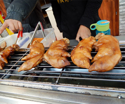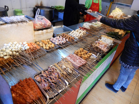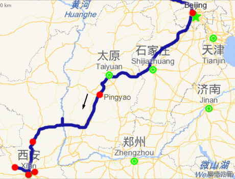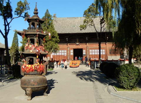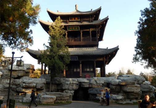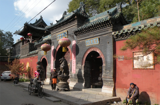 Heute lüftet sich das Geheimnis, warum in Peking so wenig Verkehr ist: Wegen des Asien-Pazifik-Gipfels mit allen nur denkbaren Putins und Obamas ist Peking innerhalb der 6. Ringstraße abwechselnd je einen Tag für Fahrzeuge mit geraden bzw. ungeraden Nummern gesperrt. Daher sind nur etwa halb so viele Fahrzeuge wie sonst unterwegs. Wir kommen daher rasch durch die Stadt und fahren, reichlich Geld an Mautstellenkassiere verteilend, nach Südwesten durch die Provinzen Hebei und Shanxi. Zunächst geht es durch eine auf zirka 40 Metern Seehöhe gelegene Tiefebene. Der Smog ist gewaltig und innerhalb der Dunstglocke hat es in der Früh schon bis zu 16 Grad. Als wir zwischen Shijiazhuang und Taiyuan das Taihang-"Gebirge" überqueren - die Passhöhe liegt knapp unter 500 Metern - fällt das Thermometer auf 7 Grad. Kurz haben wir Blick auf ein unspektakuläres Stück der Chinesischen Mauer, sonst geht es durch graubraun-farblose Landschaft. In Taiyuan machen wir einen kurzen Fotostopp an der Zwillingspagode und sehen uns den wirklich tollen Chongshan-Tempel an. Er ist in der Altstadt gelegen und es erfordert einige Mühe, den Zerberus bei allerlei Gegen-, Kreuz- und Querverkehr durch die engen Gassen zu bringen. Auch Li, der den Tempel noch nicht kannte, ist begeistert. Das Hauptgebäude stammt aus der Ming-Dynastie, weitere Gebäude wurden bzw. werden sehr geschmackvoll restauriert. Um unseren Mittagshunger zu stillen, halten wir an der Essmeile Shipin Jie (N37.867979 E112.555897), wo einem hunderte Restaurants und Stände (Taiyuan hat 2,9 Millionen Einwohner) den Mund wässrig machen. Zugegebenermaßen kommen wir nicht weit, da wir bald in einem Lokal einkehren, in dem man aus einer Vielzahl von Spießen wählen kann, die dann frittiert werden: Fleisch, Wurst, Fisch, Gemüse, Salat, Nudeln, Pilze, Tofu, Eier und reichlich unbekannte Sachen. Beim Essen schmeckt dann jeder Bissen anders. Außer man hat wie ich die scharfe Soße bestellt. An der Essmeile gibt es natürlich auch Schweinefüße, die unter anderem aus Österreich importiert werden. Hier werden sie gegrillt, gelten vielleicht nicht gerade als Delikatesse, werden aber, weil billig, gerne gegessen. Raus aus der Stadt geht es dann ziemlich zäh und so kommen wir reichlich spät zum Jin-Ci-Tempel, der selbst wenig spektakulär ist, aber in einem wunderschönen Park mit See, Pavillons und Wandelgängen gelegen ist. Schon bei Dunkelheit erreichen wir Pingyao, wo wir auf einem Parkplatz vor dem Südtor nächtigen. Km 654/2.196/28.481.