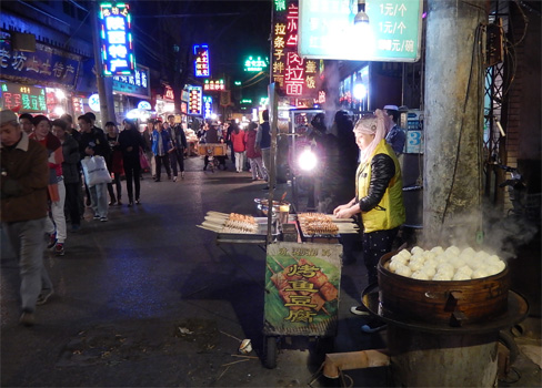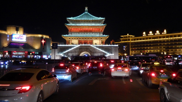 Über die Terrakotta-Armee kann ich nicht viel schreiben, da fehlen mir die Worte. Wenn ich sage, es war phänomenal phantastisch, einfach der volle Wahnsinn, so ist das noch die totale Untertreibung! Nach drei Stunden Besichtigung reißen wir uns los und fahren wieder in die Werkstätte. Dort wird der Zerberus gleich an den Diagnosecomputer gehängt. Mein Verdacht, der Turbo könnte kaputt sein, bestätigt sich. Ein Ersatzteil ist in China nicht lagernd, der normale Bestellweg über die Werkstätte dauert einige Wochen. Das Teil muss also aus Österreich geschickt werden, das geht frühestens am Montag und wird auch im günstigsten Fall einige Tage dauern. Wir sitzen also eine Woche hier fest, wie es aussieht. Der Mechaniker bietet aber an, um 70 Euro den Turbo auszubauen, zu zerlegen und wieder einzubauen, die Diagnose war ohnehin kostenlos (liebe Grüße an meine Mercedes-Werkstatt in Linz!). Aber es gibt natürlich keine Gewähr, dass dann der Turbo wieder funktioniert. Das riskieren wir natürlich. Nach der Aktion leuchtet die Motorkontrolllampe nicht mehr, aber der Diagnosecomputer ist noch bei weitem nicht zufrieden. Wir machen daher eine Probefahrt und dabei zeigt sich schon auf den ersten paar hundert Metern, dass der Zerberus wieder die Sau und 184 Pferde rauslässt. Hurra, die Reise kann weitergehen! Nach fünf Stunden in der Werkstatt ist die Rush Hour in vollem Gang. Das ist nichts für schwache Nerven! Als wir das Stadtzentrum von Xi'an erreichen, ist es bereits dunkel. Glockenturm und Trommelturm sind wunderbar beleuchtet. Wir machen einen Spaziergang durch das muslimische Viertel samt Basar, wollen uns die Große Moschee ansehen, doch die ist geschlossen, sollte eigentlich bis 21 Uhr offen sein. Wir schlendern durch den Nachtmarkt mit seiner Fressmeile, wo das Leben pulsiert, wie man so sagt, und werfen uns abwechselnd Süßes, Saures und Scharfes rein. Es ist schon reichlich spät, als wir uns auf Nachtplatzsuche machen. Ich finde in meiner GPS-Punkte-Sammlung einen, gar nicht weit weg und recht ruhig. Li ist begeistert. Km 60/2.965/29.249.