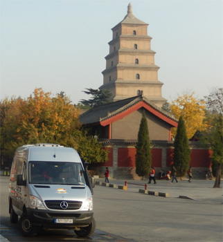 Ich erwache, weil es eisig kalt im Auto ist. Wie kann das sein? Ja richtig, ich hab irgendwann in der Nacht die Heizung abgeschaltet, weil es so heiß war. Ich schalte sie wieder ein, das Gebläse startet und schaltet sich gleich drauf wieder ab. Susi hat es auch gehört. Sie lässt im Halbschlaf einen verzweifelten Seufzer los. Ich breite eine weitere Decke über uns aus und schlafe wieder ein. Als ich wieder wach werde, ist es halb acht. Mist! Ich habe vergessen, den Wecker zu stellen, und wir sind um sieben mit Li verabredet. Ich muss ihn anrufen, er macht sich bestimmt schon Sorgen. Doch das Telefon funktioniert nicht. Dann nach ein paar Minuten doch. Ich entschuldige mich und sage ihm, wir brauchen noch eine halbe Stunde. Da es so kalt ist im Auto, will ich den Motor laufen lassen. Doch der Zerberus springt nicht an. Das Thermometer zeigt minus fünf Grad. Wie es scheint, ist der Diesel eingefroren. Das erklärt auch, warum die Heizung nicht funktioniert. Ich treffe mich kurz mit Li, um ihm die Situation zu erklären. Den Vormittag verbringen wir im Auto und immer, wenn die Temperatur um ein halbes Grad gestiegen ist, mache ich ein paar Startversuche. Aber es tut sich genau gar nichts. Zwischendurch versuche ich, eine Heizkanone aufzutreiben. Vergeblich. Es ist ein schöner Tag, die Sonne hat Kraft und lädt die Autobatterie, so dass ich wirklich sehr oft starten kann. Bis auf Feuer unter dem Auto Machen versuche ich alle mir bekannten Tricks, wärme die Dieselfilter, schütte sogar heißes Wasser über den Motor. Doch er springt einfach nicht an. Um halb eins hat es zwölf Grad und es tut sich noch immer nichts. Langsam kommen mir Zweifel, ob ich mit meiner Diagnose wirklich richtig liege oder ob die Sache nicht mit dem Leistungsverlust von gestern zusammenhängt. Nach einem letzten frustranen Startversuch entscheide ich, einen Abschleppwagen zu organisieren. Wir finden auch gleich jemanden, der einen hat, aber der ist grad unterwegs. Ich gebe bekannt, dass der Zerberus 6 Meter lang ist und 4 Tonnen wiegt. Daraufhin kommen zwei Burschen mit einem Rollmeter mit zum Zerberus, messen Länge und Höhe ab, um dann mitzuteilen, dass er zu schwer für den Abschleppwagen ist. Einer der Burschen ist angeblich Mechaniker und sagt, er kann den Motor reparieren, er hätte auch ein Diagnosegerät. Er sagt, ich soll ihn mal zu starten versuchen und - einfach nicht zu glauben - der Motor springt an. 13 Uhr 30, 14 Grad. Nun aber hurtig auf nach Xi'an! Hurtig geht natürlich nicht, denn der Motor hat noch immer keine Leistung; sobald es ein bisschen bergauf geht, kommen wir fast zum Stehen. Wir entscheiden uns trotzdem für die Autobahn, die, wieder durch Sandsteinterrassen, zum Großteil bergab verläuft, Xi'an liegt fast 1.000 Meter tiefer. Eine Stunde vor Feierabend erreichen wir die Mercedes-Werkstätte (N34.30573 E109.04614). Wir werden nobel von zwei Herren im dunklen Anzug begrüßt. Das war's dann aber auch schon. So knapp vor Feierabend geschieht nichts mehr, nicht einmal ans Diagnosegerät wollen sie das Auto anschließen. Morgen also! Das Wochenende ist in China nicht heilig, es wird auch samstags und sonntags gearbeitet. Wir wollen aber nicht hier übernachten, sondern den Abend dazu nützen, zur Terrakotta-Armee rauszufahren, die dann morgen in der Früh besichtigen und gegen Mittag in die Werkstatt kommen. Die Terrakotta-Arme liegt etwa 40 Kilometer östlich von Xi'an. Auf dem Weg dorthin fahren wir durch ein Stadtviertel, das stark an Las Vegas erinnert: tausende Laternen, grelle Leuchtreklame, riesige Hotels. Als wir unterwegs kurz einkaufen gehen, finden wir weder Butter noch Margarine im Geschäft. Li erklärt uns, dass Chinesen weder das eine noch das andere essen, weshalb es beides nicht zu kaufen gibt, ausgenommen vielleicht in ganz speziellen Läden. Natürlich haben wir heute mehrmals versucht, Winterdiesel zu bekommen, aber den gibt es noch nicht, denn hier in Xi'an soll es in den nächsten Tagen noch keinen Frost geben. Km 243/2.905/29.189.