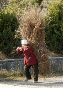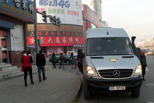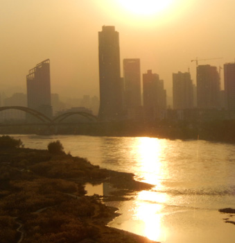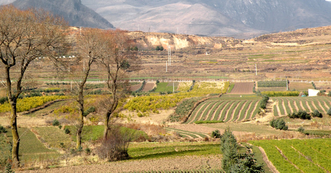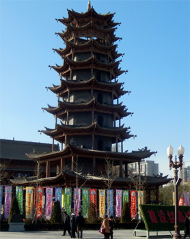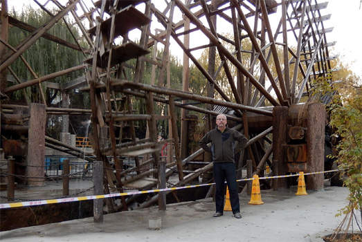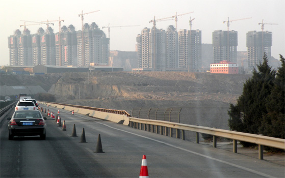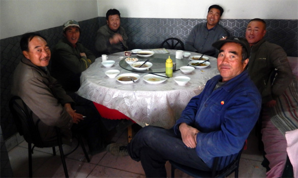 In Pingliang halten wir nur kurz zu einer Jause mit Blick auf den Kongtong Shan, einen markanten Berg mit mehreren Klöstern. Da ich ein wenig kränklich bin, juckt mich weder die Fahrt mit dem Sessellift bei knapp über null Grad, noch die Wanderung von der Bergstation zu den Klöstern. Es folgt eine zirka 100 Kilometer lange Fahrt auf der Regionalstraße, da der Expressway noch nicht fertig ist. Sie führt über einen 2.400 Meter hohen Pass, wo auf den Nordhängen ein wenig Schnee liegt. Eigenartiger Weise ist die folgende Hochebene fruchtbarer als die tiefer gelegene Gegend vorher. Teilweise ist sogar der Saatmais noch nicht abgeerntet. Auch wenn Li keine rechte Freude hat, geben wir uns eine Stadtrundfahrt durch Lanzhou, eine Zweimillionenstadt. An der Peripherie werden ganze Stadtviertel für zehntausende Menschen neu gebaut; kein Haus weist weniger als 25 Stockwerke auf! Der Verkehr, natürlich kommen wir zur besten Stoßzeit, ist enorm. Am Ufer des Gelben Flusses befinden sich riesige hölzerne Wasserräder, Nachbildungen von Bewässerungsanlagen. Der Tempel der Weißen Pagode (N36.068339 E103.814469) am Nordufer des Flusses ist zur Zeit wenig imposant, da der Turm zur Renovierung eingerüstet ist. An der Stadtausfahrt finden wir dann endlich eine Tankstelle, die Winterdiesel verkauft. Wir übernachten in einer Kleinstadt etwa eine Stunde nach Lanzhou. Km 700/3.811/30.094.