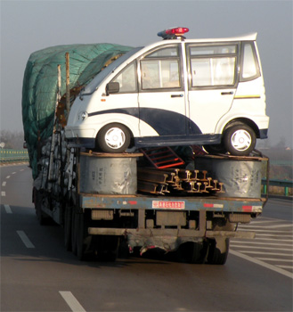 Wir sind vielleicht zwei Stunden unterwegs, als plötzlich wieder der Turbo ausfällt und der Zerberus Leistung verliert. Ich halte gar nicht an, sondern fahre weiter, so schnell der Wagen halt kann, das sind 80 auf der Ebene und bei Steigung entsprechend weniger. Wir haben nun zwei Möglichkeiten: Erstens wieder in eine Werkstatt mit der Aussicht, auf ein Ersatzteil aus der Heimat warten zu müssen, wobei niemand weiß, wie lange das dauern kann. Zweitens weiter fahren so weit es geht. Wir müssen halt damit rechnen, dass das Auto die Pässe im Himalaya nicht schafft, noch dazu, wo da ja die Luft recht dünn wird. Und wenn's nicht mehr geht, improvisieren. Bei beiden Optionen kommt erschwerend dazu, dass wir am 1. Dezember China verlassen müssen, für jeden Tag darüber würde uns Lis Agentur über 300 Euro berechnen. Wir entscheiden uns für Variante 2 und haben deshalb eine längere Diskussion via Li mit dessen Chef, der ja mehrmals täglich von Li per SMS über den Reiseverlauf informiert wird, und der möchte, dass wir eine Werkstätte ansteuern. Mit der Idee, dem Gebrechen könnte eine Bagatellursache zu Grunde liegen, halte ich an, überprüfe alle Schrauben und Befestigungen von Schläuchen und Kabeln. Ja und wirklich: auf einmal fährt die Kiste wieder mit voller Kraft, lediglich die Motorkontrollleuchte zeigt noch eine Störung an, doch auch sie erlischt im Lauf des Vormittags. Aufatmen. In Jiayuguan sehen wir uns bei eisigem Wind die Festung an, die wirklich sehr beeindruckend ist: Vor dem Panorama schneebedeckter Berge thronen über den Mauern drei chinesische Tempel. Obwohl Li unruhig ist und dauernd auf die Uhr sieht, wollen wir uns noch die beiden Signaltürme etwas außerhalb der Stadt ansehen, die als das Ende der Chinesischen Mauer angesehen werden. Hier fühlen wir uns echt geneppt: Das Gelände ist großräumig abgesperrt. Man muss Eintritt bezahlen, dann noch eine Buskarte lösen, da man nicht mit dem eigenen Auto einfahren darf, und schließlich gibt es außer einem Blick in einen tief eingegrabenen Fluss und einem kleinen Museum nichts zu sehen. Wo sind nur die Signaltürme? Auf der Weiterfahrt werden wir von Li, der zahlreiche SMS mit seinem Chef wechselt, wiederholt gedrängt, den Zerberus in Dunhuang in die Werkstätte zu bringen, da danach nur mehr sehr eingeschränkte Möglichkeiten einer Reparatur bestünden. Doch wir sind überzeugt, das bringt nichts. Entweder ist wirklich nur ein Stecker locker, dann fahren wir mit dem Turbo noch bis Kanada, oder es liegt was Gröberes vor, dann kann die Werkstatt ohne Ersatzteil wohl nichts machen. Die Autobahn verläuft parallel zu einem Hochgeschwindigkeitsbahngleis und mehreren Hochspannungsleitungen durch die deswegen nicht recht stimmungsvolle Wüste Gobi. Wir übernachten in Dunhuang am Rand der Sanddünen und sind bald in der Heia, denn beide fühlen wir uns grippig. Km 669/4.939/31.223.