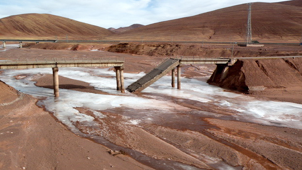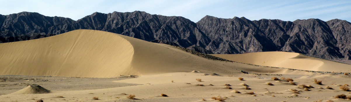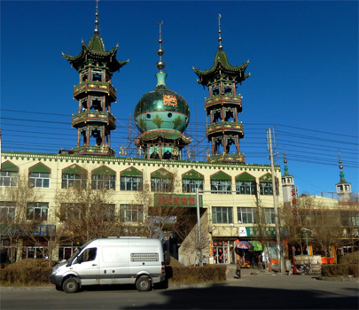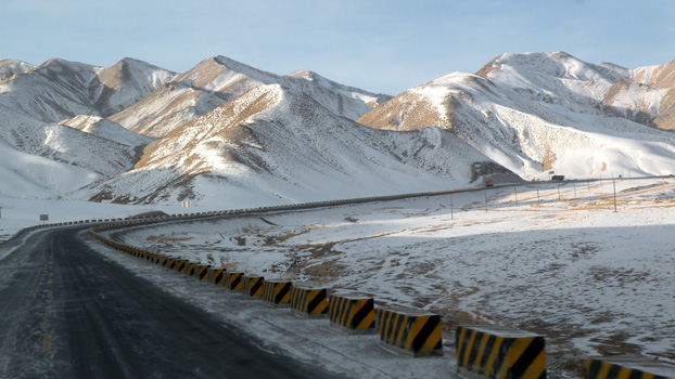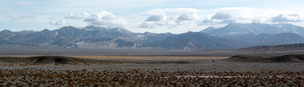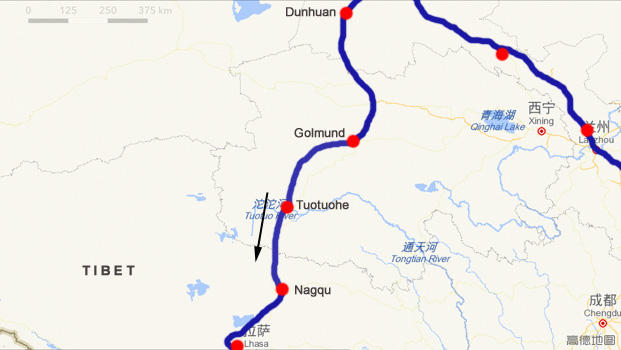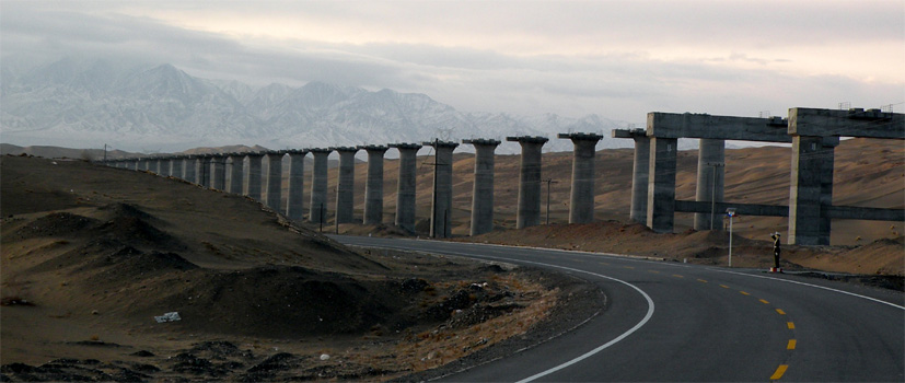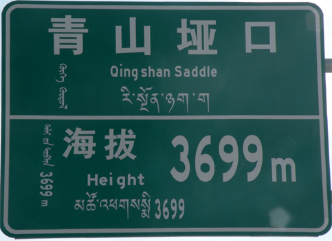 Südlich von Dunhuan quert die Fernstraße einen Ausläufer der Dunhuan-Dünen. Gleich daneben befindet sich das Gleis der Hochgeschwindigkeitsbahn in Bau, das die Dünen auf Stelzen quert. Die Straße führt nun in steilem Anstieg bis zu einem 3.647 Meter hohen Pass über das Altun-Gebirge, das hier den nördlichen Abschluss des tibetischen Hochlandes bildet. Auf der Nordseite liegt ein wenig Schnee, auch auf der Straße. Auf der Südseite fällt das Gebirge flach in eine riesige, auf etwa 3.000 Metern gelegene, schneefreie Hochebene. Hier beginnt unsinnigerweise (weil null Verkehr) wieder die Autobahn, die über hunderte Kilometer schnurgerade verläuft, gelegentlich ein flaches Gebirge quert und von massenweise Stromleitungen begleitet wird. Wie es scheint, wird Kohle, die hier vorkommt, gleich an Ort und Stelle in thermischen Kraftwerken verheizt. Die Gegend ist meist Wüste, gelegentlich wächst Steppengras, hin und wieder sieht man eine Jurte. An mehreren Salzseen befinden sich Salinen. Orte gibt es keine. Solange ich nur Auto fahre, macht mir die Höhe keine Probleme, doch bin ich bei einem Boxenstopp vom hinters Auto Gehen, Pinkeln und wieder Einsteigen schon außer Puste. Am Nachmittag erreichen wir Golmund (auch Golmud oder Germu), wo uns Li anweist, für die Fahrt der nächsten Tage Sauerstoffflaschen zu kaufen. Wir denken zunächst, er macht einen Scherz, doch er meint es völlig ernst. Also kaufen wir, wie er, jeder zwei mal 14 Liter Sauerstoff. Den gibt es um wenig Geld an jeder Ecke. Allerdings bezweifle ich sehr, dass die paar Liter irgendwie helfen können, wenn man höhenkrank ist. Wir kaufen auch noch Lebensmittel ein, vor allem Obst und Gemüse, da die Versorgungslage bis Lhasa schlecht ist und in Lhasa alles recht teuer sein soll. Hier vielleicht ein paar Bemerkungen zur chinesischen Küche: Das Essen in China ist ausgesprochen abwechslungsreich und lecker, ganz anders als das Zeugs, das man bei uns in China-Restaurants bekommt. Es ist auch sehr billig (ab 1,50 Euro incl. Tee), solange Fleisch nur in Spuren drin vorkommt. Meist ist es scharf; süß-sauer war bisher eher die Ausnahme. Natürlich ist der Reis allgegenwärtig, doch der schmeckt mir hier mittlerweile, auch Nudeln gibt es häufig. Wenn wir mit Li essen gehen, sagen wir immer, er soll zwei Gerichte bestellen, die wir noch nicht kennen. Wenn wir am Abend alleine Essen gehen, was Li gar nicht mag, weil er sich nicht vorstellen kann, wie wir uns verständlich machen, wählen wir ein Lokal aus, in dem schon Leute essen. Wir gehen von Tisch zu Tisch und zeigen dann der Wirtin, was wir wollen. Das finden die anderen Gäste meist recht lustig. Km 550/5.527/31.840.