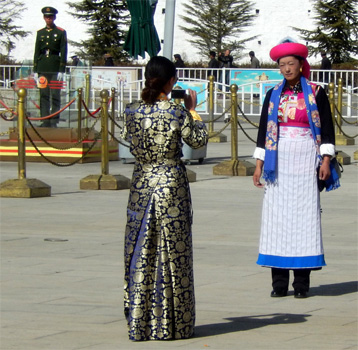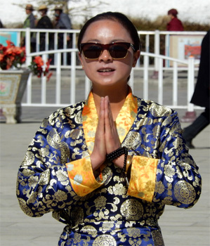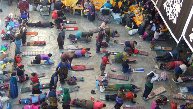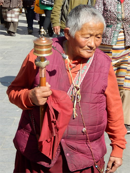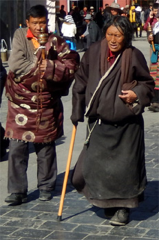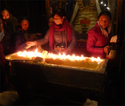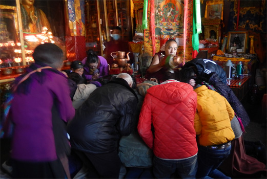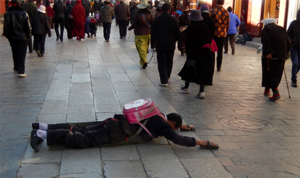 Um kurz nach drei Uhr erwache ich, weil es im Auto eiskalt ist. Der Strom ist ausgefallen. Ich gehe ins Hotel, wo die zwei Rezeptionistinnen auf Sofas in der Lobby pennen. Ich wecke eine auf und konfrontiere sie mit meinem Problem. Sie zuckt nur mit den Schultern. Ich hole mir aus dem Besenkammerl eine Leiter, um zu der Steckdose an der Decke zu gelangen, wo unser Kabel angestöpselt ist. Hier ist kein Strom. Ein Blick in den Sicherungskasten zeigt, dass eine Sicherung gefallen ist. Ich drücke sie wieder rein, doch es tut sich nichts. Wir müssen den Rest der Nacht den Motor laufen lassen, um es warm zu haben. Aber ich kann nicht mehr ordentlich schlafen. Ich bekomm einfach keine Luft und das, obwohl wir uns nur auf 3.650 Meter befinden. Ich habe einfach das Gefühl, ich muss mich zum tief Atmen zwingen, sonst ersticke ich. Doch ich bin voll müde und immer wenn ich einschlafe, scheine ich aufs Atmen zu vergessen. Denken und Träumen verschwimmen: Denke ich ans Krankenhaus, Lungeninfarkt und ans Sterben oder träume ich davon? Jedenfalls bin ich im Halbschlaf der Verzweiflung nahe, möchte auf dem schnellsten Weg nach Hause. Susi berichtet mir in der Früh, dass ich enorm lange Atempausen hatte und dann ganz wild nach Luft schnappte. Erst nach dem Frühstück ist alles vorbei, ich kann wieder ganz normal atmen. Ich bitte die Rezeptionistin, die Stromversorgung für unsere Heizung in Ordnung bringen zu lassen, und dann fahren wir mit dem Taxi zur Barkhor. Hier befindet sich das religiöse Zentrum Lhasas; tausende Pilger kommen täglich hierher und umkreisen unter den Augen vieler chinesischer Polizisten im Uhrzeigersinn auf dem Pilgerpfad den Jokhang-Tempel. Viele Pilger tragen Gebetsmühlen mit Stiel, die sie ständig schwingen. Manche werfen sich alle paar Meter, andere alle drei oder auch nur alle zwei Schritte bäuchlings auf den Boden. Solche Pilger sind uns gestern auf der Fahrt nach Lhasa auch schon begegnet. Man musste höllisch aufpassen, nicht einen zu überfahren, weil sie für ein paar Momente auf der Straße liegen. Vor dem Eingang des Jokhang-Tempels bildet sich eine mehrere hundert Meter lange Schlange, doch das Anstellen hier scheint niemanden zu stören, alle sind im Gebet. Wer wie wir ein Ticket kauft, braucht sich nicht anzustellen, sondern kommt durch einen eigenen Eingang rasch in den dreistöckigen Tempel. Hier schieben sich die Pilger, einer dicht hinter dem anderen, von einer Nische zur nächsten. Dort, wo die gänsemarschartige Prozession der Pilger stockt, schieben Mönche kräftig an. In den Nischen befinden sich Statuen und Opfergefäße. Die Pilger legen überall Geldscheine meist minimalen Wertes ab, leeren Yakmilch in Gefäße oder geben Yakbutter in Tröge, in denen dann Kerzen brennen und einen gewöhnungsbedürftigen Geruch verbreiten. Über eine Treppe gelangen wir auf das Dach des Tempels, von dem man einen wahnsinnig tollen Ausblick auf den Tempelvorplatz, den Pilgerpfad und auf den Potala-Palast hat. Später machen wir einen Spaziergang durch die lebhaften Altstadtgassen zur wenig spektakulären Großen Moschee. Ziemlich erschöpft schleppen wir uns ins Saint Louis Cafe, wo wir uns bei einem unglaublich teuren Kaffee mit Blick auf den Potala-Palast erholen. Wir spazieren über den Potala-Platz und sind vom Anblick des Palastes tief bewegt. Gläubige, die versuchen, sich hier zu Boden zu werfen, werden von Polizisten in Zivil weggewiesen. Wir sehen uns nun noch den Chagpo Ri-Tempel an, der sich total von allen bisher gesehenen Tempeln unterscheidet: Das Kernstück ist eine mit Vordach versehene und mit religiösen Motiven bunt bemalte Felswand, ein wenig abseits steht ein riesiger aus aufgestapelten Steinplatten gebildeter Turm. Um den Turm befindet sich ein Stahlgerüst, an dem tausende bemalte Steinplattenreliefs befestigt sind. Zum Abschluss des Tages gönnen wir uns ein tibetisches Fondue: Aus hunderten Sorten kleiner Spieße wählen wir unser Essen aus, das wir dann bei Tisch in Gefäßen mit zwei verschiedenen kochenden Flüssigkeiten garen. Reichlich scharfes Zeugs wird uns zum Würzen an den Tisch gebracht. Abgerechnet wird nach Anzahl der Spieße. Wir haben zusammen 80 (!) gegessen, sind ja nur Häppchen. An anderen Tischen Essen Leute mühelos das Doppelte. Zurück im Hotel müssen wir feststellen, dass unser Stromproblem noch nicht gelöst ist. Wir rufen Li an, der mit Hilfe des Hotelelektrikers für unseren Strom sorgt.