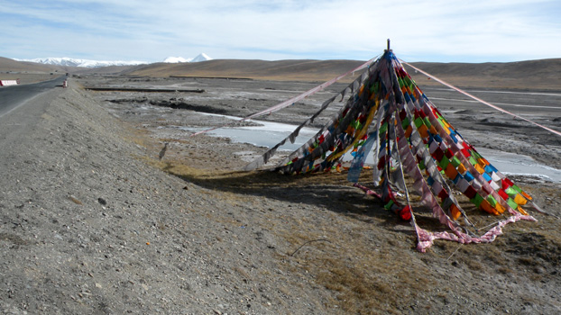 Am Morgen hat es minus 15 Grad! Wir sind sowas von müde und antriebslos. Vielleicht liegt das ja nicht nur an der Höhe, sondern auch daran, dass wir schon seit Tagen keinen Kaffe mehr trinken, weil der nicht mehr schmeckt, seit mit der Höhe der Siedepunkt des Wassers so niedrig ist. Den ganzen Tag quält uns die Verkehrspolizei mit Section Control und langsam Fahren, 50 bis 70 ja nach Abschnitt. Diese Geschwindigkeitsvergewaltigung schützt jedenfalls nicht vor Verkehrsunfällen, da beim langsam Fahren die Aufmerksamkeit sinkt. Leider kommen wir auch zu einem Unfall. Ein Kleinlaster ist von der Straße abgekommen und liegt im Straßengraben. Wir und auch andere halten an. Der Motor des LKW läuft noch, die Windschutzscheibe ist zerbröselt, der Fahrer war nicht angeschnallt, er hängt zum Fenster hinaus, die Beine noch im Fahrerhaus, aber Oberkörper und Kopf unter dem Wagen eingequetscht. Ihm ist nicht mehr zu helfen. Waren Berge bisher eher kleinere Erhebungen aus der Hochebene, so tauchen nun erstmals echte Berge mit Gletschern auf. Oftmals sind Seile mit Gebetsfahnen über die Straße oder einen Fluss gespannt, auch die Häuser entlang der Strecke sind mit Fahnen geschmückt. In Lhasa gibt es mächtig Ärger, weil Li in einem Hotel eincheckt, ohne sicherzustellen, dass wir einen Stromanschluss kriegen. Wir dürfen im Nachbarhotel gegen sehr reichlich Gebühr an die Steckdose, doch dort ist das Netz überlastet und die Sicherung fällt. Die Rezeptionistin ruft einen Elektriker und lässt uns gleich wissen, dass wir den bezahlen müssen. Nach langem Hin und Her geht alles gut aus, weil der Chef des Hotels, in dem Li eingecheckt hat, aus der selben Stadt ist wie Li und plötzlich kriegen wir dort einen Stromanschluss und gratis noch dazu. Nur die resolute Rezeptionistin vom Nachbarhotel will das Geld nicht mehr zurückgeben, das wir schon bezahlt haben, obwohl der Elektriker vom Nachbarhotel ihr Problem ganz rasch behoben hat. Die Dame nehme ich mir später ohne Li vor und sie rückt wirklich die Kohle wieder raus. Zum Abendessen probieren wir im Tibet Steak House Yak-Steaks. Sehr zum empfehlen! Km 326/6.720/33.003.