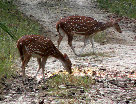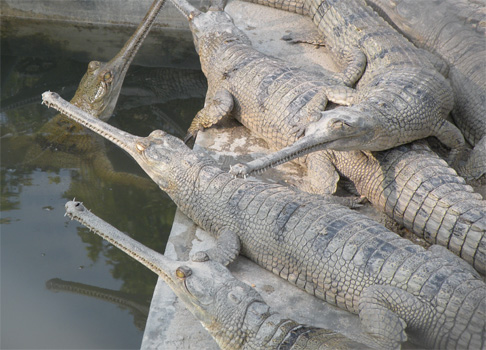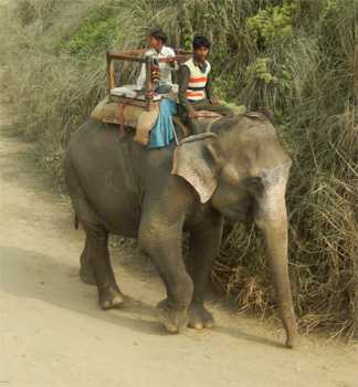 Die Enttäuschung ist groß: Wir dürfen nicht mit dem Zerberus in den Chitwan-Nationalpark einfahren. Also buchen wir notgedrungen für den Nachmittag eine Halbtages-Jeepsafari, die mit 2.500 Rupien (20 Euro) p.P. zuzüglich zum Parkeintritt von 1.500 Rupien (12 Euro) p.P. recht kostengünstig ausfällt im Vergleich zu afrikanischen Nationalparks. Wir spazieren zum peinlich leeren naturhistorischen Museum, das mit einigen Fotos an der Wand und zwei Geweihen aufwartet und zum Elefantengehege, wo man eine Elefantenfamilie aus der Nähe betrachten kann. Den Rest des Vormittags verbringen wir auf einer Terrasse über dem Rapti River bei einem zweiten Frühstück, einem dritten Kaffee und einem Mittagessen. Ein paar Krokodile räkeln sich wie wir in der Sonne. Zu Mittag geht's mit dem Einbaum über den Fluss und dann mit einem "Jeep" indischer Bauart durch den Park. Irgendwie ein komisches Gefühl, auf Safari zu sein und zu wissen, dass man keine Giraffen oder Zebras sehen wird. Nach vier Stunden sind wir erstens trotz Jacke total ausgefroren, denn die Sonne hat sich verabschiedet, und zweitens nochmals ziemlich enttäuscht, denn die Ausbeute an Tieren, die wir vor die Linse bekommen haben, ist mager: Krokodile, ein paar Hirsche, einige Affen, ein Leguan, Störche, ein Wildschwein, Rehe. Im Park gibt es eine Zuchtstation für Gharial-Krokodile, das sind die mit dem dünnen schnabelförmigen Maul. Km 62/8.577/34.857.