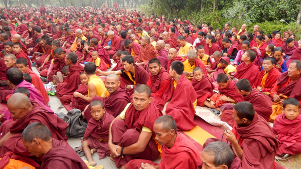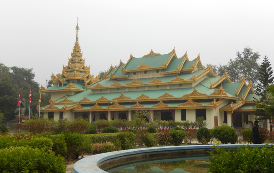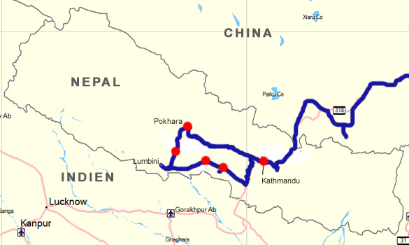 Wir machen einen Morgenspaziergang durch die engen und steilen Gassen Tansens (N27.867237 E83.543058), können uns im Gegensatz zum Reiseführer aber nicht für das Dorf erwärmen: viel Müll, heruntergekommene Häuser, ungepflegte alte Tempel. Es sind noch viele Kurven, bis wir endlich in Butwal die Ganges-Tiefebene erreichen, wo es dunstig und schwül ist. Unser heutiges Ziel ist Lumbini, die Geburtsstätte Siddhartha Gautamas, Begründer des Buddhismus. Um sie wurde ein vier mal zweieinhalb Kilometer großer Park angelegt, dessen Zentrum der nach Siddharthas Mutter benannte Maya Devi-Tempel (N27.469564 E83.275785) ist. Daneben befindet sich der Teich, in dem Maya Devi 563 v. Chr. ein Bad genommen haben soll, worauf die Wehen einsetzten. Schon von weitem ist ein eintöniges rhythmisches Gemurmel zu hören, das beim Näherkommen immer lauter wird und sich als Gebet tausender (!) Mönche erweist. Sie sitzen teils in einem Zelt, teils im Freien und beten im Rahmen der 23. Gebetswochen für universellen Frieden. In dem riesigen Park wurden seit 1978 von verschiedenen buddhistischen Völkern Klöster in verschiedenen Stilrichtungen erbaut. So finden sich chinesische, tibetische, thailändische, kambodschanische, vietnamesische, koreanische, nepalesische Klöster. Etwa so wie Minimundus, nur groß. Da die Wege im Park lang sind, mieten wir eine Rikscha, deren Fahrer uns bequem von Tempel zu Tempel bringt. Natürlich beschäftigt uns die Frage, ob wir uns schlecht fühlen müssen, weil der Rikschafahrer strampeln muss, während wir bequem sitzen, oder ob wir uns gut fühlen dürfen, weil wir ihm Arbeit geben. Dass wir die Frage auf die Schnelle nicht abschließend beantworten können, ist kein Wunder, fand doch Siddharta Gautama auch erst nach 49 Tagen die Erleuchtung. In- und außerhalb des Parks gibt es bettelnde Kinder, Frauen, alte Menschen und Behinderte. Nun fahren wir nach Osten, es ist eben, die Straße ist meist gerade, ein Dorf reiht sich ans nächste, viele Menschen, Motorräder, Autos, Tiere sind auf der Straße. Mittlerweile habe ich mich ganz gut an das Fahren in Nepal gewöhnt. Jeder fährt, wo Platz ist, und bremst, bevor es kracht. Eine Hand ist immer an der Hupe. Es gibt anscheinend nur eine Vorrangregel: Der Überholende hat Vorrang. Überholt wird auch in den unübersichtlichsten Kurven. Wer zum Überholen ansetzt, hupt und wird vom Überholten vorgelassen, sogar der Gegenverkehr bremst rücksichtsvoll ab. Wir übernachten in einem Wald an der Fernstraße; ich entzünde mal wieder ein kleines Lagerfeuer. Km 193/8.515/34.795.