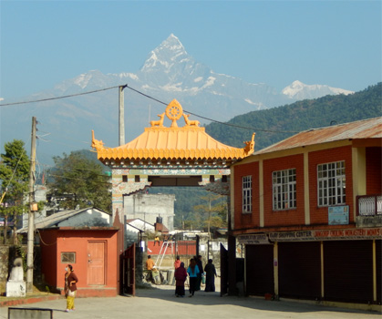Die Bergkulisse hinter dem Lake Phewa ist grandios: Das Annapurna-Gebirge und der markante siebentausend Meter hohe Machapuchare ragen in die Höhe. Wir besuchen die tibetische Flüchtlingssiedlung Tashi Palkhel nördlich von Pokhara, um uns das Kloster Jangchub Choeling Gompa (N28.261510 E83.956592) anzusehen. Zahlreiche sehr junge Burschen in Mönchsgewändern stehen herum, das buddhistische Priestertum hat anscheinend keine Nachwuchsprobleme. Leider lässt man uns nicht in den Tempel, weil er gereinigt wird. Wir machen kurz halt an den eher unspektakulären Devi's Falls (N28.189974 E83.959199), sehenswert ist jedoch, wie der Fluss im Erdboden verschwindet. Nun fahren wir zur Weltfriedenspagode (N28.201000 E83.944847) hinauf, wobei der Weg steil, die Straße schlecht und die Kurven eng sind. Aber die Aussicht auf Pokhara, den Phewa-See und den nahen Berg Sarangkot vor dem Panorama der Himalaya-Gipfel sind echt toll! Bis Butwal sind es 156 Kilometer, aber die Straße, bekannt als der Siddharta-Highway, ist sowas von kurvig und schmal, und in jeder Kurve kommt uns ein Lastwagen entgegen, dass wir bis zum Abend nur drei Viertel schaffen. Wir übernachten in einem Föhrenwald bei Tansen. Km 152/8.322/34.602.