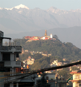 Obwohl es total nebelig ist, sind viele Autos (Fahrräder und die meisten Motorräder sowieso) ohne Licht unterwegs. Der Nebel lichtet sich erst, als wir die Tiefebene auf dem Tribhuvan-Highway verlassen und ins Mahabharat-Gebirge hinauffahren. Dieser "Highway" wurde erst in den 50er-Jahren fertiggestellt und erst seit diesem Zeitpunkt ist Kathmandu mit dem Auto erreichbar. Die Straße ist schmal, sehr kurvig, wenig befahren und führt von unter 200 auf fast 2.500 Meter. Als wir über den Pass fahren, eröffnet sich uns urplötzlich ein unglaubliches Bergpanorama: Über fast 180 Grad liegt der Himalaya vor uns ausgebreitet, fast alle Gipfel wolkenfrei, klares Wetter, beste Sicht. Ein Wahnsinn! Man muss sich vorstellen, dass die westlichsten sichtbaren Gipfel von den östlichsten gut 400 Kilometer entfernt sind! Die weitere Fahrt bis Kathmandu zieht sich ziemlich, ist halt viel Kurverei und ab der Einmündung in die Straße Kathmandu-Pokhara in Naubise ist viel Verkehr. In Kathmandu steuern wir den auf einem Berg in der Stadt gelegenen buddhistischen Tempel Swayambhunath (Affentempel) an, der seinen Namen von den hunderten Rhesusaffen hat, die hier leben. Wider Erwarten kann man den Berg hinauffahren, es gibt sogar reichlich Parkplätze. Der Tempel ist eigentlich ein riesiger Stupa mit einer weißen Halbkugel als Basis und einem darauf aufgesetzten goldenen Turm; er ist von weiteren Tempeln, interessanterweise auch hinduistischen, umgeben. Nach Sonnenuntergang wird für die Affen Futter ausgestreut, was die ohnehin schon wilde Horde zum Wahnsinn treibt. Als wir zum Auto zurückkommen, hat sich der Parkplatz schon weitgehend geleert und es bietet sich an, hier zu übernachten. Wir sitzen schon eine Weile im Auto, als es draußen laut wird. Es hört sich nach Tumult an. Eine Demonstration? Unruhen? Ich gehe nachsehen: Hinter dem Zerberus ist ein Kloster, in dem buddhistische Mönche sich Streitgespräche liefern. Sie schreien sich an, tun so, als würden sie einander schlagen, klatschen in die Hände, werden von anderen angefeuert. Nach 20 Minuten ist die Show zu Ende und es kehrt Ruhe ein. Km 198/8.775/35.055.