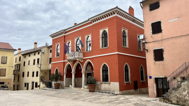 Wir sehen uns die mittelalterliche, kleine Stadt Bale an, um deren Zentrum, ein venezianisches Kastell, enge Gassen in konzentrischen Ringen verlaufen. Eine große Kirche, orangefarbenes Rathaus, Uhrturm, eine kleine Kapelle mit alten Fresken, alles sehr nett und keine Leute da. In Rovinj spazieren wir durch die Altstadt hinauf zur Kirche Sv. Eufemija und versuchen, beim Abstieg zum Uhrturm auf dem abgewetzten Pflaster nicht auszurutschen. Am Nachmittag sehen wir uns noch das alte Dorf Sveti Lovreč an und, weil in der Sonne so gut sitzen ist und es hier hinter der Kirche einen ansprechenden Parkplatz gibt, verlängern wir die Kaffeepause bis zum Morgen. Km 53/703.
