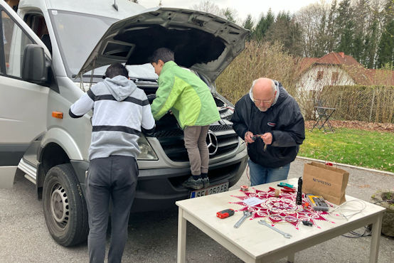 Heute hole ich den Zerberus aus dem Winterquartier. Leider ist das mit etlichen Komplikationen verbunden. Zunächst springt er nicht an, weil alle Batterien leer sind. Das ist ein wenig verwunderlich, da ich ja alle paar Wochen den Motor kurz laufen gelassen habe, aber anscheinend war das letzte Intervall doch zu lang. Nach einem frustranen Versuch mit Starterkabeln gelingt die Reanimation mit einem starken Ladegerät. Als ich die Motorhaube schließen will, bleibt mein Blick an bunten Kabeln hängen, die im Motorraum baumeln. Bei näherer Betrachtung wird klar, dass hier ein Marder sein Unwesen getrieben hat. Er hat die Ummantelung des Kabels zur Lambdasonde auf 40 Zentimetern Länge abgefressen und die darin befindlich gewesenen Kabel vielfach durchgebissen. Auch am Dieseltemperatursensor sind die Kabel durchtrennt. Nicht weiter verwunderlich, dass die Motor-Kontrollleuchte eine Störung anzeigt. Schon verwunderlich, dass die Rückfahrkamera nicht funktioniert. Das sehe ich mir später an. Zuerst müssen die Kabel im Motorraum repariert werden. Dankenswerterweise stellt mir die Familie unserer Tochter einen guten Platz zum Arbeiten, Strom, Werkzeug und zwei technikversierte Söhne zur Verfügung. Die finden auch gleich eine weitere Baustelle: Auch die Leitung zum Drucksensor im Dieselpartikelfilter ist auf fast 20 Zentimeter abgefressen. Es gelingt uns rasch, das Kabel an der Lambdasonde zu reparieren, am Dieseltemperatursensor ist es schwierig, weil man da kaum hinkommt. Aber unter Einsatz von chirurgischen Instrumenten (kein Scherz!) gelingt es doch. Als es dunkel wird, müssen wir abbrechen.