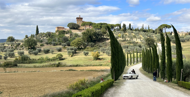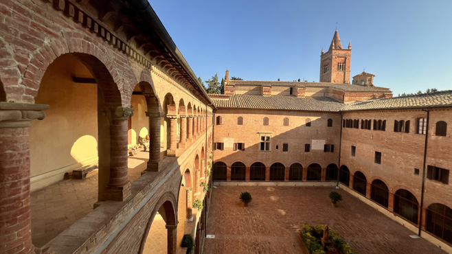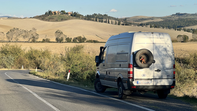 Wir starten zeitig in der Früh, halten Mittagsrast in Palmanova, der genial achteckig angelegten Stadt südlich von Udine, und erreichen die südlich von Siena gelegene und an eine Mondlandschaft erinnernde Crete bei schönstem, abendlich-goldenen Licht. Wir übernachten auf einem Parkplatz vor dem Kloster Monte Oliveto. Km 870.