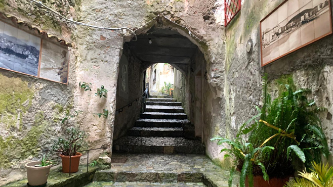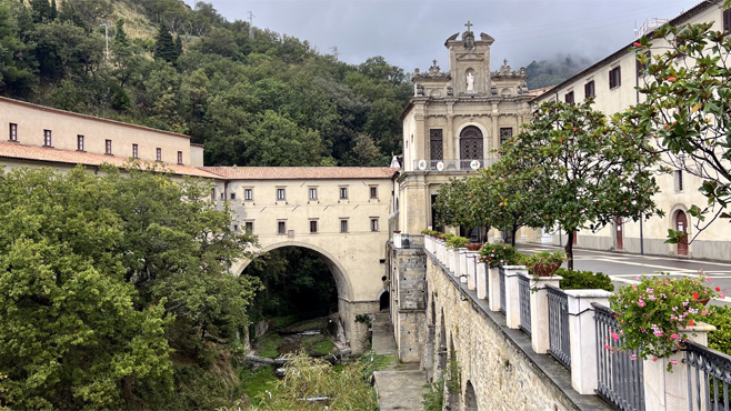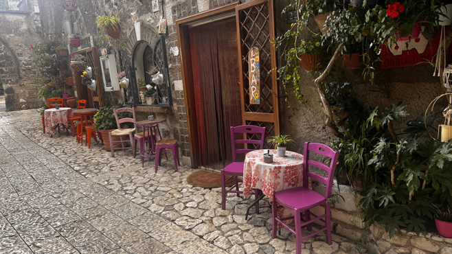 Nach 300 Straßenkilometern verbringen wir den Tag in Caserta. Zunächst sehen wir uns das Schloss San Leucio an, das früher neben pompösen Räumlichkeiten eine Seidentextilfabrik beherbergte und von dem es einen schönen Blick auf den Vesuv gibt. Zum Mittagessen fahren wir hinauf auf die auf einer Anhöhe gelegene mittelalterliche Stadt Casertaveccia. In einem netten Lokal bestelle ich gebratenes Wildschwein, das dann erstens ohne jede Beilage kommt und zweitens völlig ungenießbar ist. Nach einem Bissen sag ich dem Wirt, er kann's wieder abservieren, was er ohne jeden Kommentar auch macht. Sabine ist so selbstlos und lässt mich an ihrer Pizza teilhaben. Wieder unten in Caserta besuchen wir die hinter dem riesigen Schloss (größer als der Buckingham Palace) auf einem Hang gelegene, vier Kilometer lange Parkanlage. Zuerst wollen sie mich mit dem E-Scooter, den ich wegen meiner Gehbehinderung mithabe, nicht in den Park lassen, aber das aufgeklebte Behindertenlogo wirkt Wunder. Sabine muss leider gehen. Die Nachtplatzsuche gestaltet sich sehr schwierig, die Gegend ist praktisch durchgehend dicht besiedelt und ziemlich heruntergekommen, es gibt keinen Platz, an dem man bedenkenlos nächtigen möchte. Wir steuern daher einen teuren Stellplatz am Fuß des Vesuvs an. Km 365/1.376.