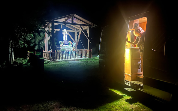 Der nächtliche Sturm hat ein Bäumchen quer über den Zufahrtsweg zu unserer Lichtung gelegt, das sich nur unter Einsatz von Säge und Hacke entfernen lässt. Unser erstes Ziel heute ist die Piedigrotta, eine Höhle am Meer, die im 17. Jahrhundert von überlebenden Schiffbrüchigen angelegt wurde und seither als Kapelle dient. In der Höhle befinden sich zahlreiche Statuen, einige Figuren wurden erst in letzter Zeit hinzugefügt, etwa jene, die John F. Kennedy und Papst Johannes Paul II. zeigen. In Pizzo machen wir kurz am Strand unter der Burg für einen Spaziergang halt. Als wir wieder abfahren wollen, springt der Zerberus nicht mehr an. Um zu verstehen, warum ich gleich voll in Panik gerate, muss man wissen, dass ich in den letzten Monaten zweimal den Starter erneuern lassen musste. Der Mechaniker hat damals gemeint, sollte der Starter wieder kaputt gehen, müsste man das Getriebe zerlegen, um die Schwungscheibe auszutauschen. Beim nächsten Startversuch springt der Motor aber an und wir sind lange unentschlossen, was wir weiter tun sollen. Wir entscheiden, 50 Kilometer nach Lamezia Terme zurückzufahren, um die dortige Mercedes-Werkstätte aufzusuchen. Dort sind sie sehr freundlich, nehmen sich sofort für uns Zeit, schließen den Diagnosecomputer an, finden aber keinen Fehler, raten uns, ein Relais auszutauschen, das sie aber nicht vor Dienstag ins Haus bekommen. In der Annahme, dass das Schwungrad und nicht das Relais ursächlich ist, setzen wir die Reise fort. Die Werkstatt nimmt übrigens kein Geld von uns, nicht mal ein Trinkgeld. In Zungri sehen wir uns noch die Citta di Pietra an, eine bis ins 15. Jahrhundert bewohnte Höhlensiedlung. Wir übernachten in Parghelia auf einem Parkplatz, der nur durch drei Meter hohes Schilf vom Meer getrennt ist. Der Starter hat übrigens bisher keine weiteren Probleme gemacht.1 Km 223/2.196.