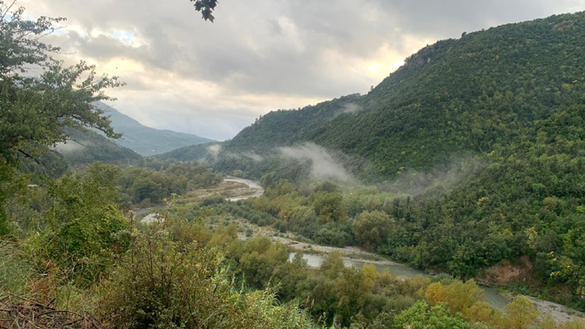 Nach einem Bad im Meer (gemeint ist ein Fußbad) fahren hinauf nach Pisciotta, spazieren durch die alte Stadt und blicken auf das wolkenverhangene Meer hinunter. In Praia a Mare wollen wir uns die Grottenkirche ansehen, sind schon mit Regenjacken und Wanderstöcken ausgestattet, als wir nach wenigen Schritten feststellen müssen, dass der Weg hinauf zur Grotte gesperrt ist. Im nächsten Moment macht es einen Schütter, der uns ohnehin den Aufstieg verleidet hätte. Vom Auto aus sehen wir uns die Isola di Dino an und einen der vielen Wachtürme, die hier wegen der Sarazenenüberfälle errichtet wurden. In Scalea steigen wir während einer Regenpause durch die Altstadt hinauf zur Festung, von wo man einen tollen Blick über die Neustadt hat. Nun geht es durch die Lao-Schlucht nach Papasidero, zumindest geplant wäre das gewesen. Doch die Straße endet bei einem Kraftwerk und das Bergdorf muss ausfallen. Im Flussbett weidet eine riesige Ziegenherde. Kaum hat uns der Leitbock wahrgenommen, springt er auf die Straße und alle Ziegen folgen. Wir übernachten auf einem Mini-Campingplatz vor Diamante direkt am Meer, wo ein heftiges Gewitter über uns niedergeht. Km 169/1.830.