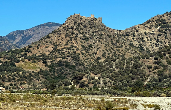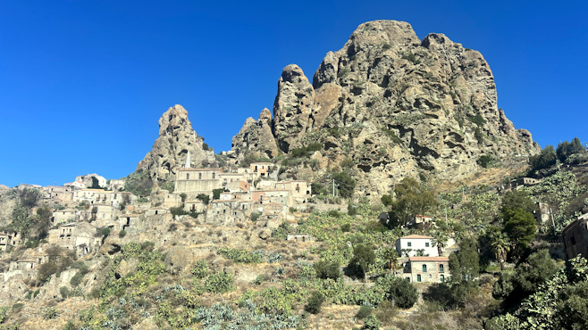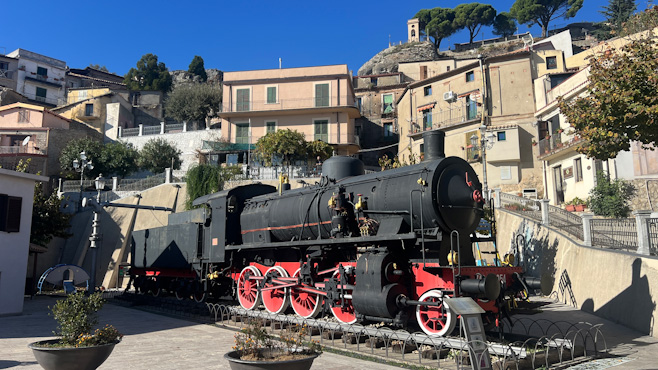 Sonntags und zeitig in der Früh kommen wir staufrei nach Reggio di Calabria. Es gibt auch reichlich Parkplätze, sogar direkt vor dem Dom. Der ist eher klein und auf einen Turm oder gar zwei hat man beim Bau vergessen oder ist das Geld dafür dem organisierten Verbrechen zum Opfer gefallen? Wer weiß. Auch das Castell ist ziemlich winzig ausgefallen. Unsere Fahrt führt nun mit schönen Blicken auf den rauchenden Ätna um die Stiefelspitze Italiens herum. Hier ist alles plötzlich nicht mehr grün, sondern braun, von der Sonne des Sommers verbrannt. Wir fahren zu dem kleinen Dorf Pentedatillo hinauf, das malerisch unter einem Felsen, der an fünf Finger erinnert, gelegen ist. Der Ort ist seit einem Erdbeben 1873 unbewohnt, trotzdem dürfen ein paar Souvenirläden nicht fehlen. Von Amendolea fahren wir auf einer wirklich abenteuerlich steilen Straße mit engsten Kurven zur verfallenen Burg Ruffo hinauf. Von hier könnte man in das Bergdorf Bova weiterfahren, doch die Straße dorthin sieht nicht weniger abenteuerlich aus. Es siegt die Vernunft, wir fahren über den weitaus längeren Weg über die Küstenstraße, wir haben dem Zerberus ohnehin hier schon viel zugemutet. Bova ist wie ausgestorben. Die Straße endet am Dorfplatz und es gibt sogar freie Parkplätze. Ein Espresso und ein Cafe corretto kosten je einen Euro und der Wirt stellt sogar noch selbstgemachten Kuchen dazu. Auf einem weiteren Platz steht, völlig unpassend für ein Bergdorf, eine alte Dampflokomotive. Die hat vor langer Zeit ein Bürgermeister hertransportieren lassen als Zeichen für den Fortschritt. Der allerdingst ist nirgendwo zu sehen. Abends fahren wir noch in die Bergstadt Gerace, wo wir ein nettes Plätzchen für die Nacht finden. Wir sind schon sehr hungrig, finden aber lange kein offenes Restaurant. Manche haben saisonbedingt zu, andere sperren erst später am Abend auf und wieder andere servieren nur Kleinigkeiten. Dann aber findet der Tag bei einer Pizza einen guten Abschluss. Heute war es mit 27 Grad und strahlendem Sonnenschein echt heiß. Km 192/2.511.