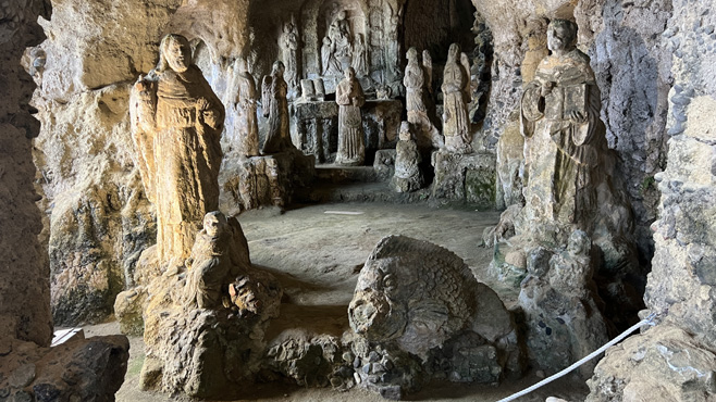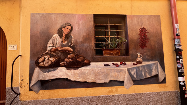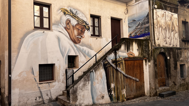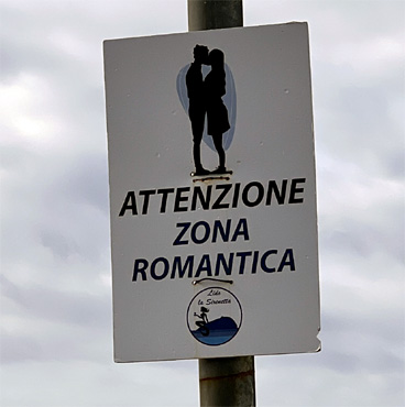 Der Ort Diamante ist bekannt für die Murales (Wandmalereien), die einen Spaziergang durch die Gassen zu einem Erlebnis machen. Weil es gerade sonnig ist, sitzen wir eine Weile an der Uferpromenade, wo witzigerweise ein Warnschild eine romantische Zone ausweist. Als wir später durch die kleine, alte, auf einem Hügel gelegene Stadt Piemontese spazieren, nieselt es schon wieder. Die Stadt ist charmlos und kaum bewohnt. Nun folgt ein Besuch bei Franziskus von Paola. Wir treffen ihn in einem Kloster, in einer Nebenkapelle der Klosterkirche, wo seine heiligen Gebeine in einem Schrein ruhen. Man kann seine Schuhe, lederne Kleidung, ein Stück eines Knochens und ein Zahn bestaunen. In Cosenza sehen wir uns die Sammlung moderner Skulpturen an, die die Fußgängerzone zieren. Wir campieren auf einer Waldlichtung nahe der Autobahn. Km 141/1.972.