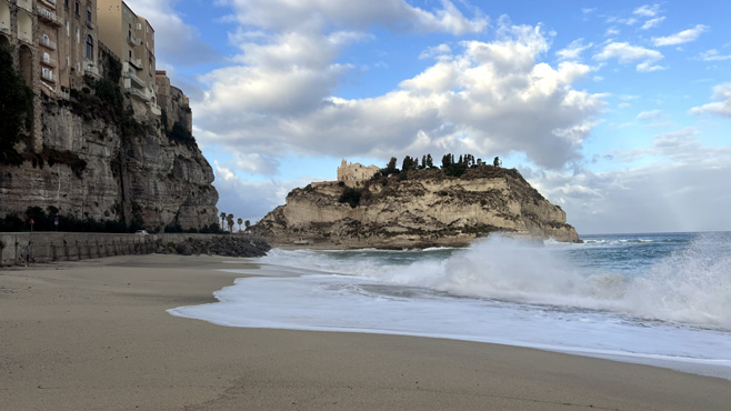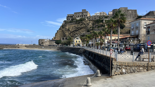 Als würden die Häuser jeden Moment abstürzen, liegt die Altstadt von Tropea auf der Steilküste. Auf einem Felskegel, nur schmal mit dem Land verbunden, befindet sich eine Kirche, zu der Sabine aufsteigt; ich schone mein Bein. Wir halten kurz am Capo Vaticano für einen Blick in die Brandung und machen dann einen verlängerten Mittagsstopp an einem Sandstrand bei Palmi. Leider ist alles total vermüllt, man fühlt sich wie in einem Dritte-Welt-Land, und es dauert eine Weile, bis wir einen halbwegs akzeptablen Platz finden. Es ist sehr warm, wir sitzen lange in der Sonne und nehmen auch ein Bad. An der Strandpromenade in Scilla essen wir ein Eis mit Blick auf die Burg, die über der Stadt thront. In der engen und verwinkelten Ausfahrt aus der Stadt verkeile ich um ein Haar den Zerberus in einer bogenförmigen Unterführung mit unmittelbar folgender scharfer Abbiegung. Einige Kilometer weiter sind wir schon nahe an Sizilien: Messina scheint nur einen Steinwurf weit entfernt. Wir übernachten über Scilla neben einer Kapelle mit Blick auf Sizilien, eigentlich ein toller Nachtplatz, aber es kommen immer wieder Autos, die neben uns parken und dann wieder abfahren. Das macht kein gutes Gefühl, aber im Dunkeln einen neuen Platz zu suchen ist auch keine Option. Km 123/2.319.