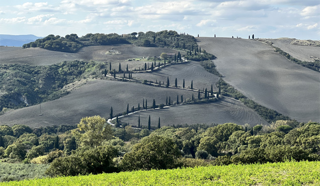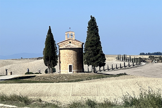 Nicht, weil die Mönche so lange schlafen, sondern wegen der Morgenmesse sperrt das Kloster erst um halb zehn auf. Aber ein schöner Kreuzgang mit Fresken und ein Museum belohnen das Warten. Auf der weiteren Fahrt durch die südliche Toskana halten wir an der Capella Vitaleta. Wir sind erstaunt, wieviele Touristen noch unterwegs sind. In Pienza essen wir in der Altstadt im Freien zu Mittag (Wildschwein) und genießen die tolle Aussicht auf die sanfte Landschaft. Ein echtes Highlight ist Civita di Bagnoregio, eine mittelalterliche Stadt auf einem Tuffsteinfelsen. Weil der weiche Untergrund durch die Erosion langsam abbröckelt, wird sie auch die "sterbende Stadt" genannt. Angeblich gibt es nur mehr zehn ständige Einwohner. Die Stadt ist nur über eine Fußgängerbrücke erreichbar, zu der wir uns mit einem Shuttlebus bringen lassen, weil die Zufahrt für Fahrzeuge über 2,5 Tonnen verboten ist. Sowohl bei der Hin-, als auch bei der Rückfahrt fährt uns der Bus vor der Nase davon und wir müssen jeweils länger warten. Der Blick von einem Aussichtspunkt vor der Brücke ist grandios. Leider entschließe ich mich in einem Anfall von Selbstüberschätzung, über die Brücke in die Stadt hinüberzugehen. Es geht zunächst weit hinunter und drüben wieder hinauf und natürlich später alles zurück. Mein kürzlich gebrochenes Bein dankt es mir mit heftigem Schmerz. Km 141/1.011.